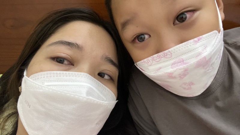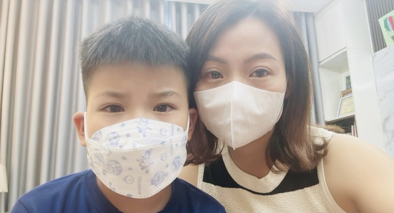 | Chị Lê Thanh Huyền, trú ở Cầu Giấy, Hà Nội cùng con trai cũng bị đau mắt đỏ |