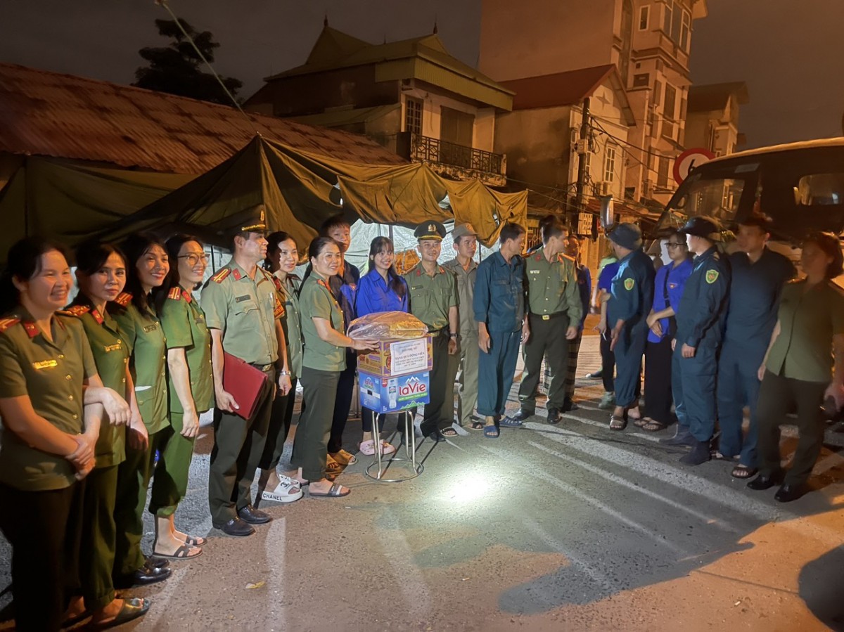 | Hội phụ nữ Công an quận Bắc Từ Liêm trao tặng nước uống, mì tôm, nhu yếu phẩm cho lực lượng chốt cửa khẩu đê sông. |