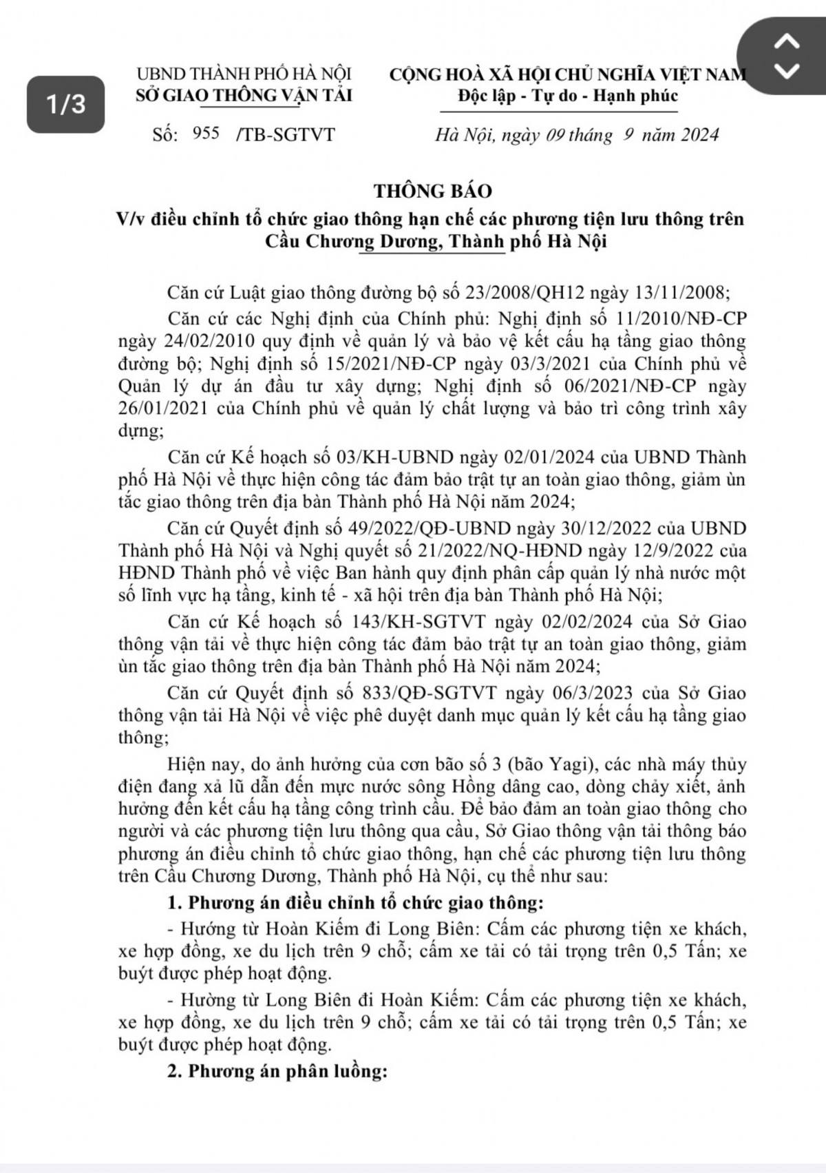 Theo đó, Hiện nay, do ảnh hưởng của cơn bão số 3 (bão Yagi), các nhà máy thủy điện đang xả lũ dẫn đến mực nước sông Hồng dâng cao, dòng chảy xiết, ảnh hưởng đến kết cấu hạ tầng công trình cầu. Để bảo đảm an toàn giao thông cho người và các phương tiện lưu thông qua cầu, Sở Giao thông vận tải thông báo phương án điều chỉnh tổ chức giao thông, hạn chế các phương tiện lưu thông trên cầu Chương Dương, thành phố Hà Nội, cụ thể như sau: