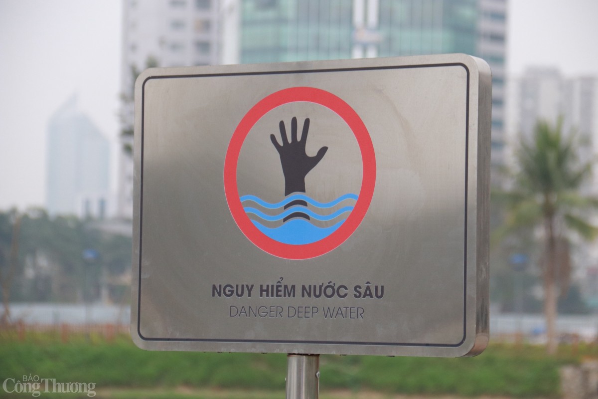 | Biển cấm "Nguy hiểm nước sâu" được đặt tại khu vực ven hồ công viên. Ảnh: Thanh Tuấn |