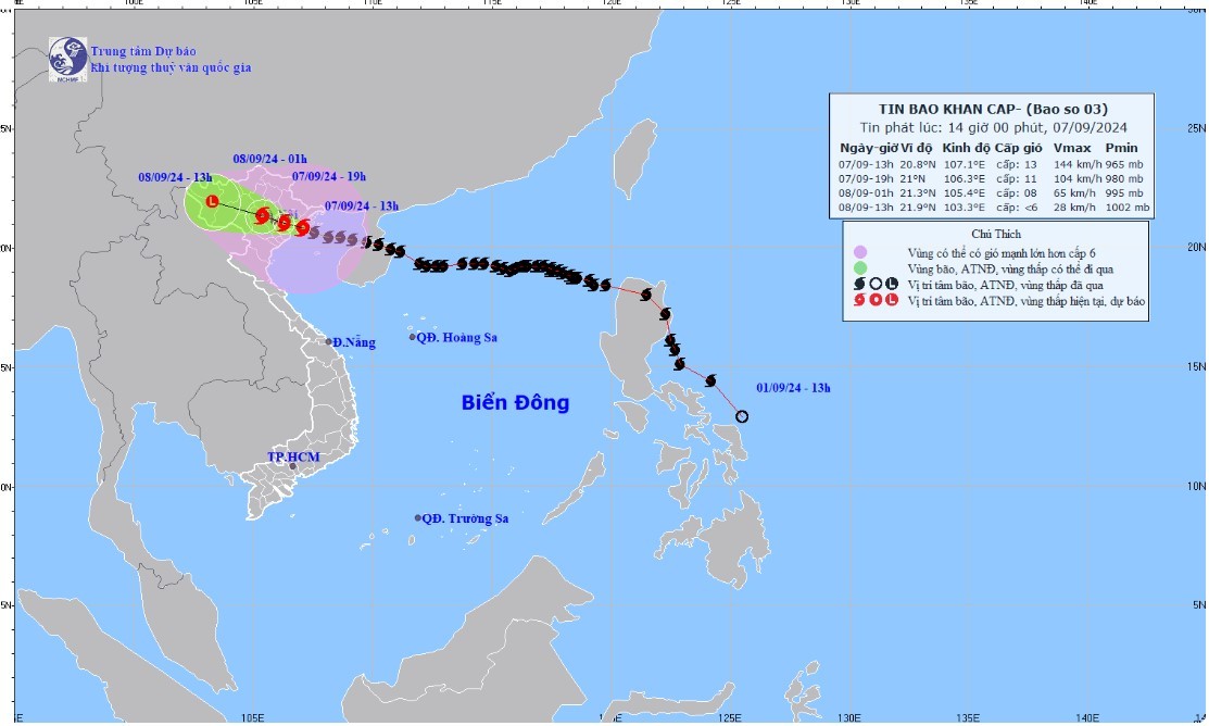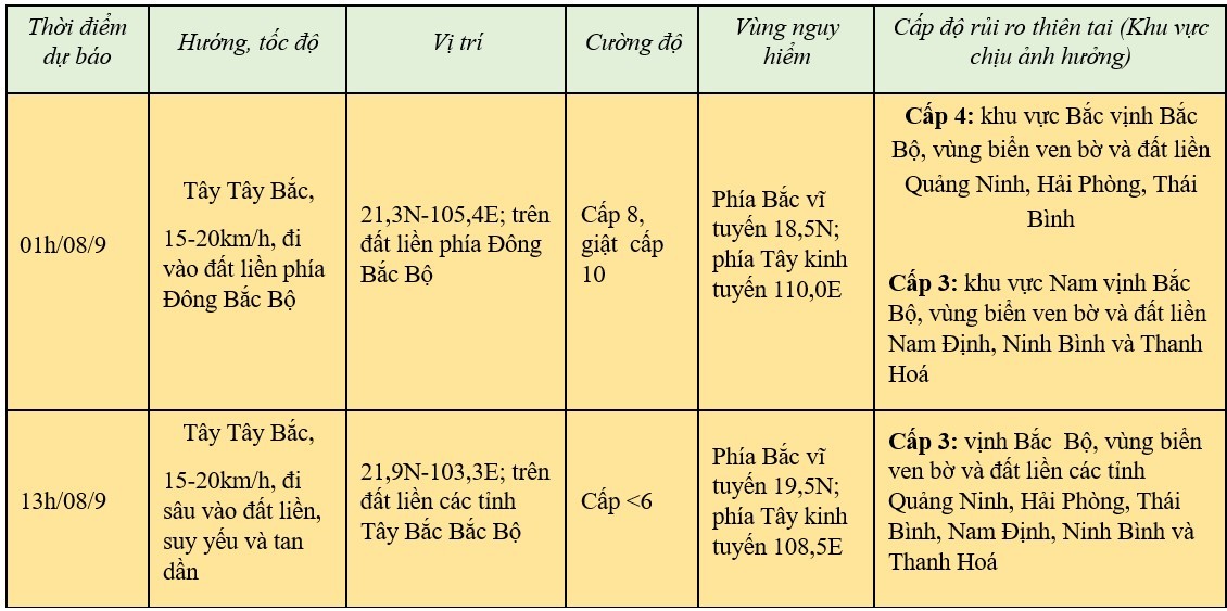 Theo Trung tâm Dự báo khí tượng thủy văn quốc gia: Hồi 14h ngày 7/9, Vị trí tâm bão: Khoảng 20.9 độ Vĩ Bắc; 106.9 độ Kinh Đông, trên vùng ven bờ biển Quảng Ninh – Hải Phòng. Sức gió mạnh nhất: Cấp 12-13 (118-149km/h), giật cấp 16. Dự báo: Trong 3 giờ tới, bão di chuyển theo hướng Tây Tây Bắc, tốc độ khoảng 15-20km/h.