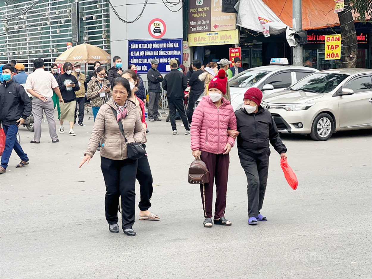 Trước cổng bệnh viện K (cơ sở Tân Triều), dù cầu bộ hành được xây dựng cách đó không xa, người dân vẫn lựa chọn "băng luôn qua đường" với lời lí giải rằng: "Như thế cho nhanh!". |