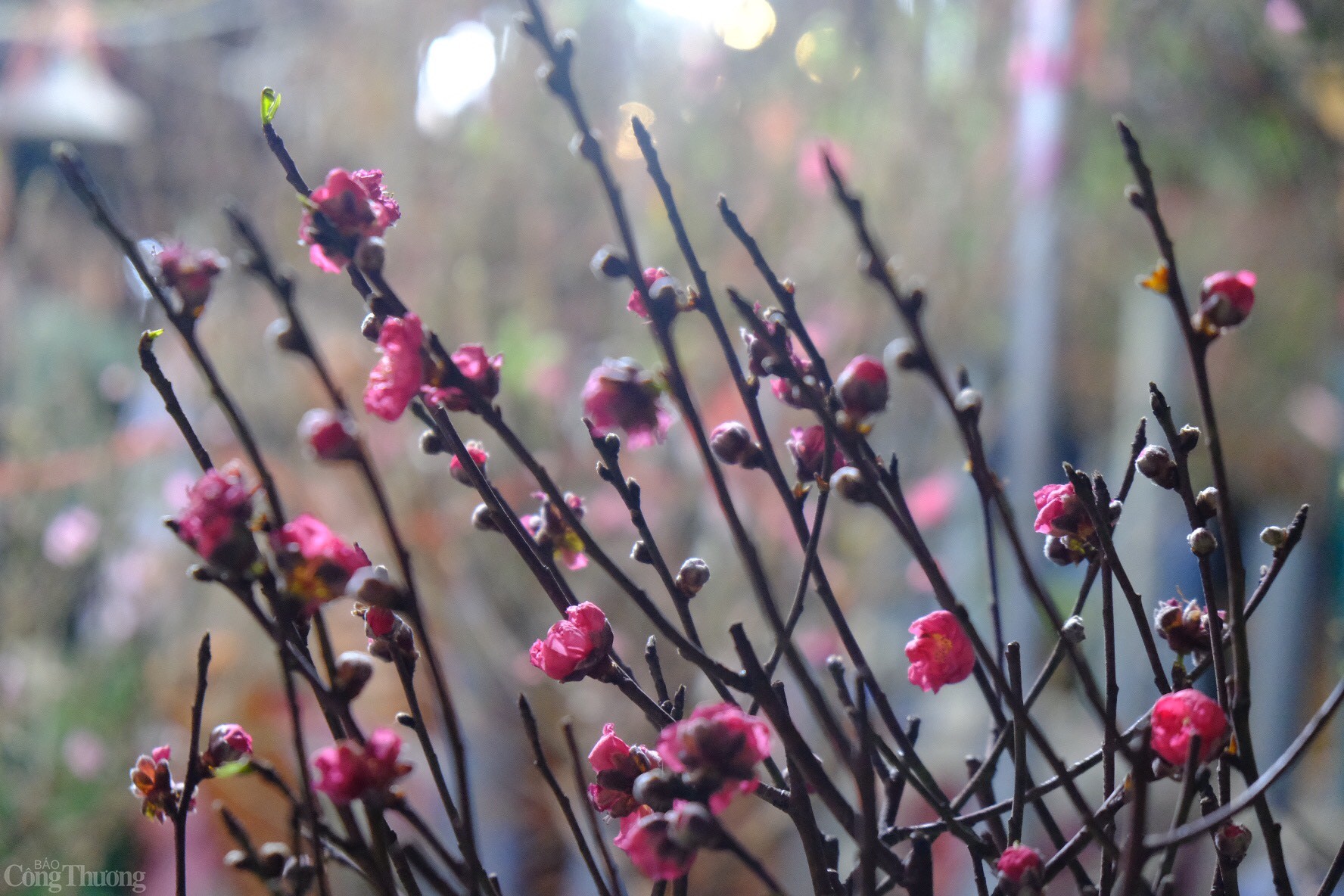 | Cành đào cỡ bé có giá từ 100-300 nghìn đồng/cành. Ảnh: Lê An |