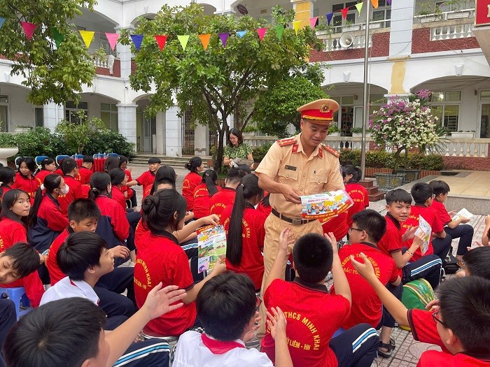 | Cán bộ Đội Cảnh sát Giao thông - Trật tự Công an quận Bắc Từ Liêm phát tờ rơi tuyên truyền an toàn giao thông cho các em học sinh tại Trường THCS Minh Khai, quận Bắc Từ Liêm, Hà Nội. Ảnh: Bích Trần |