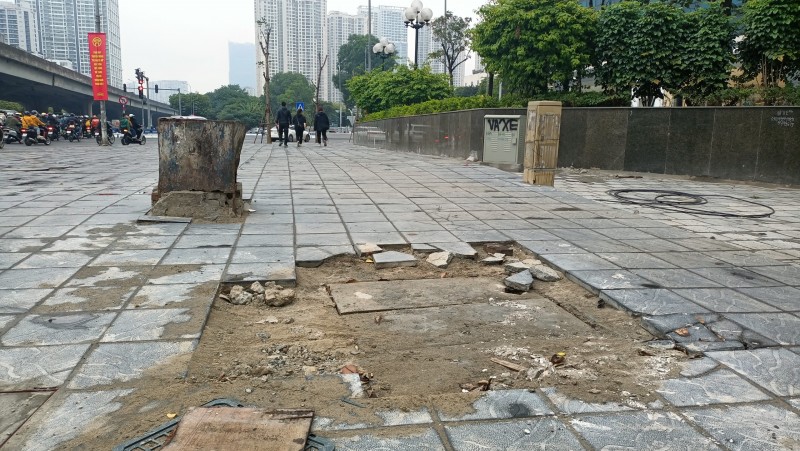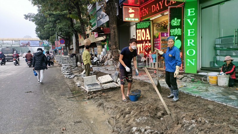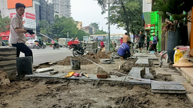 | Vỉa hè ở khu vực số 57 Trần Duy Hưng tiếp tục được lát đá |