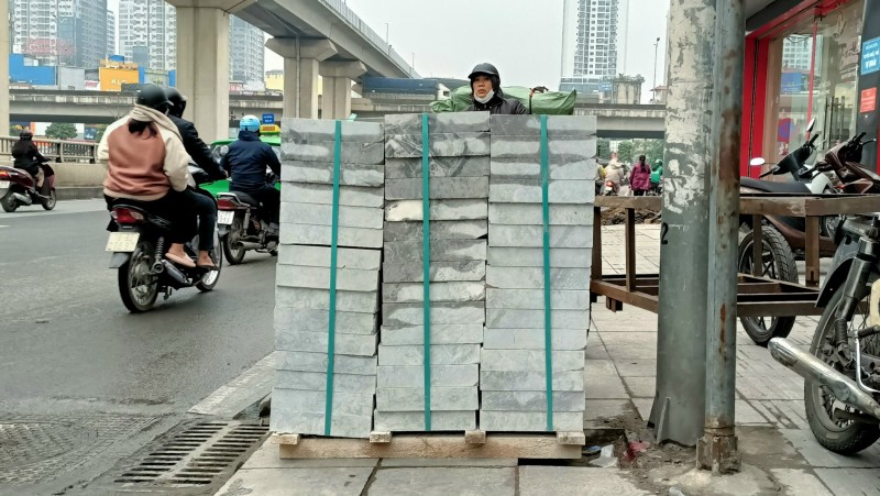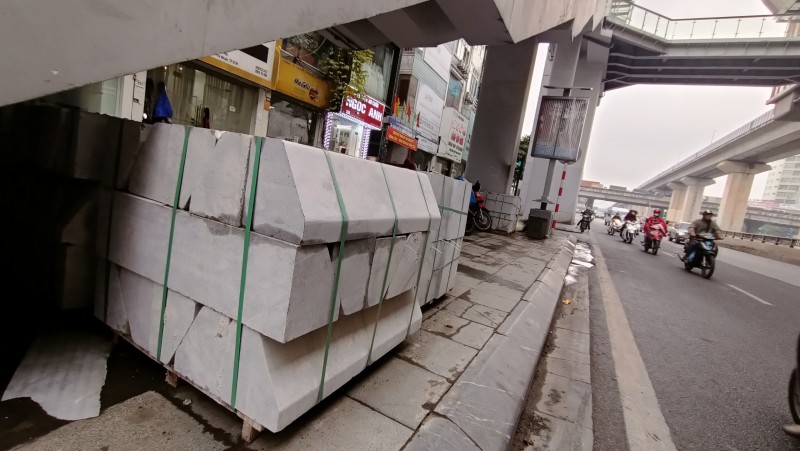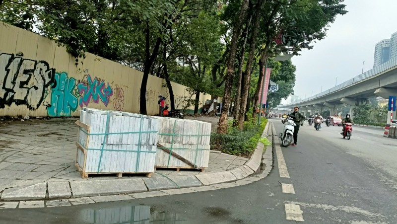 Tại con phố Nguyễn Trãi (quận Thanh Xuân), hàng loạt các đống gạch đang được xếp dọc cả tuyến phố. Những chồng gạch này sẽ được chuẩn bị cho quá trình lát lại vỉa hè đã bị hư hỏng nặng.