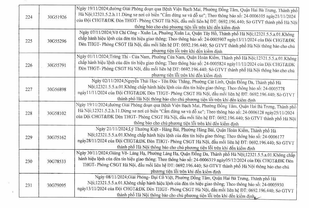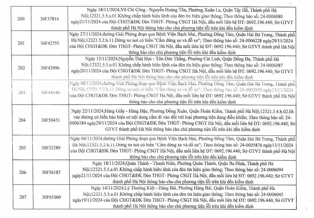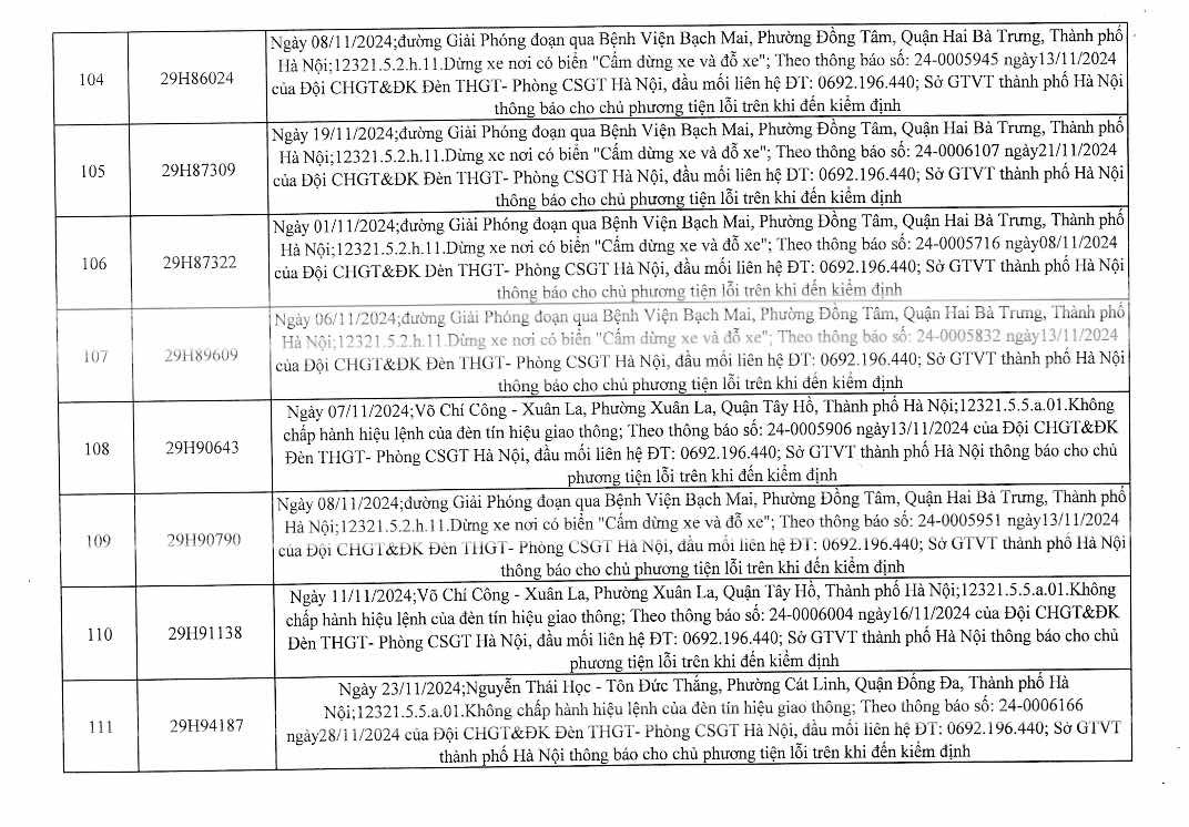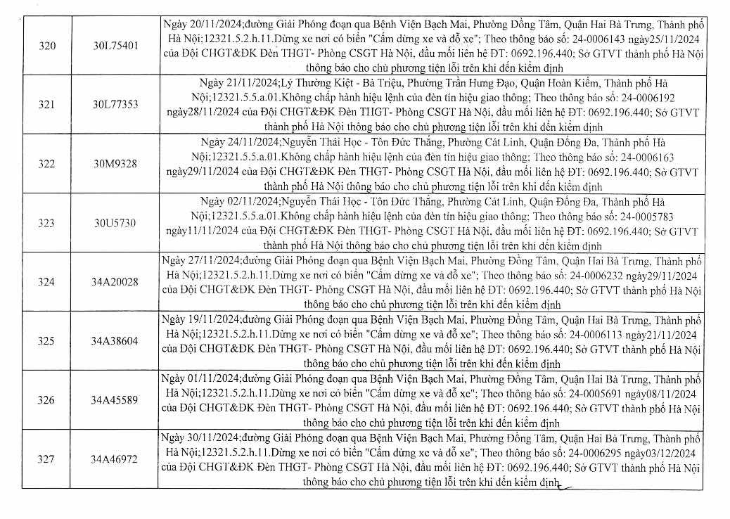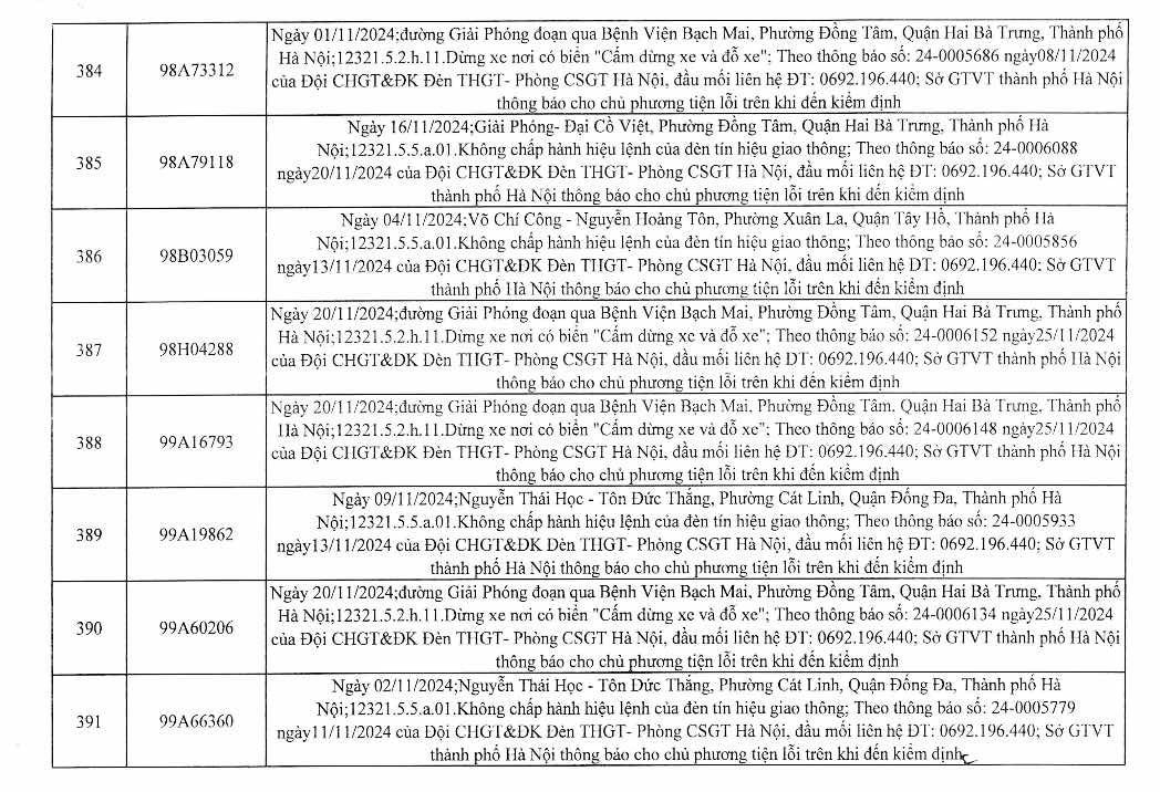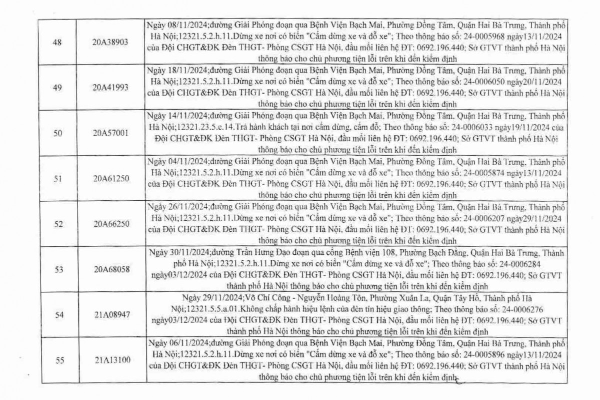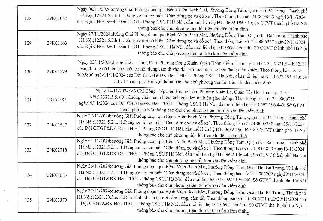 | Danh sách xe phạt nguội từ Công an thành phố Hà Nội cung cấp |
