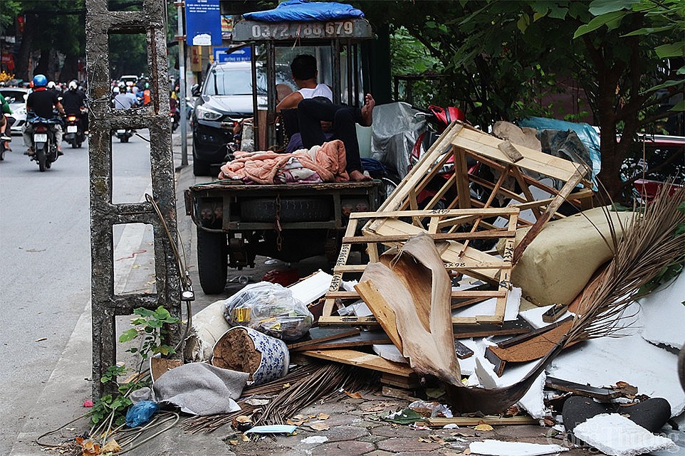 | Theo ghi nhận của phóng viên Báo Công Thương, tại nhà chờ xe buýt tuyến Đê La Thành, bên cạnh là nơi để đón các tuyến xe buýt thì còn là nơi xả thải phế liệu của người dân. |