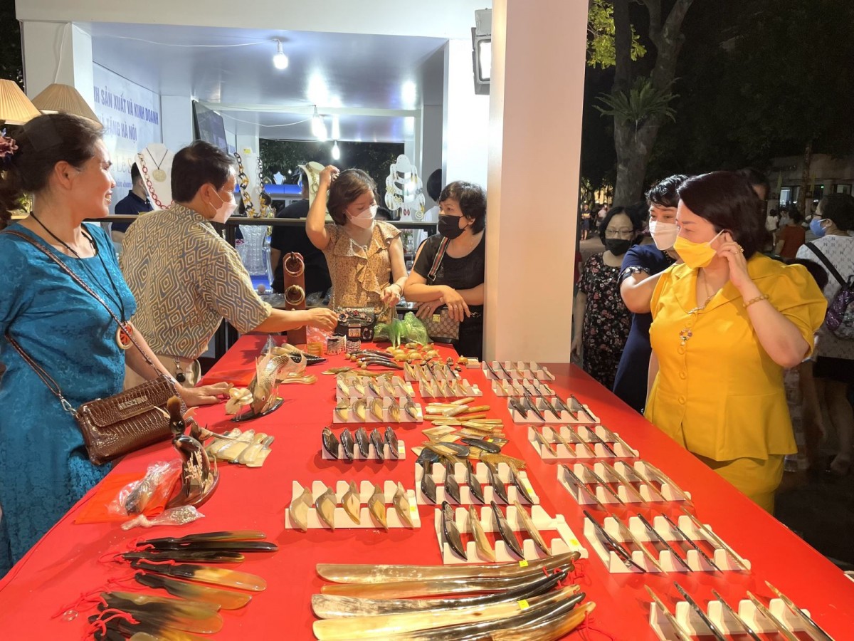 | Giới thiệu sản phẩm du lịch làng nghề truyền thống tại phố đi bộ Hà Nội. Ảnh: Hương Trà |