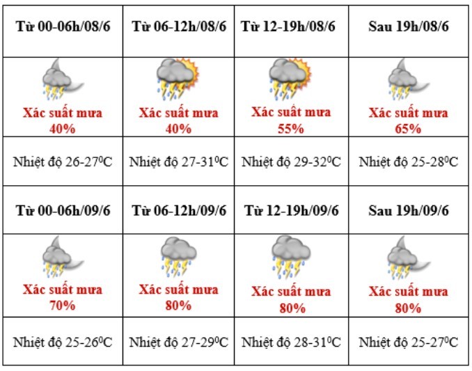 Chi tiết cụ thể: Xác suất mưa ngày thi đầu tiên, 8/6 thấp dưới 65% nhưng ngày 9/6, xác suất mưa dao động từ 70 - 80%.