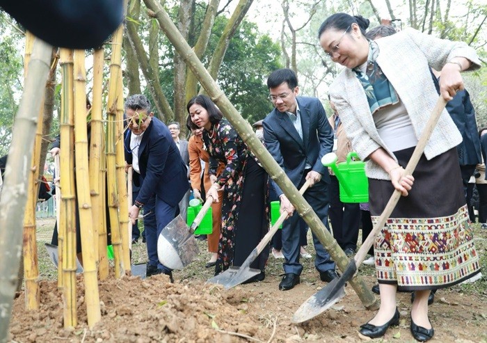 | Đại biểu tham gia trồng và chăm sóc rặng tre tại khuôn viên Khu di tích Quốc gia đặc biệt Đền Sóc |