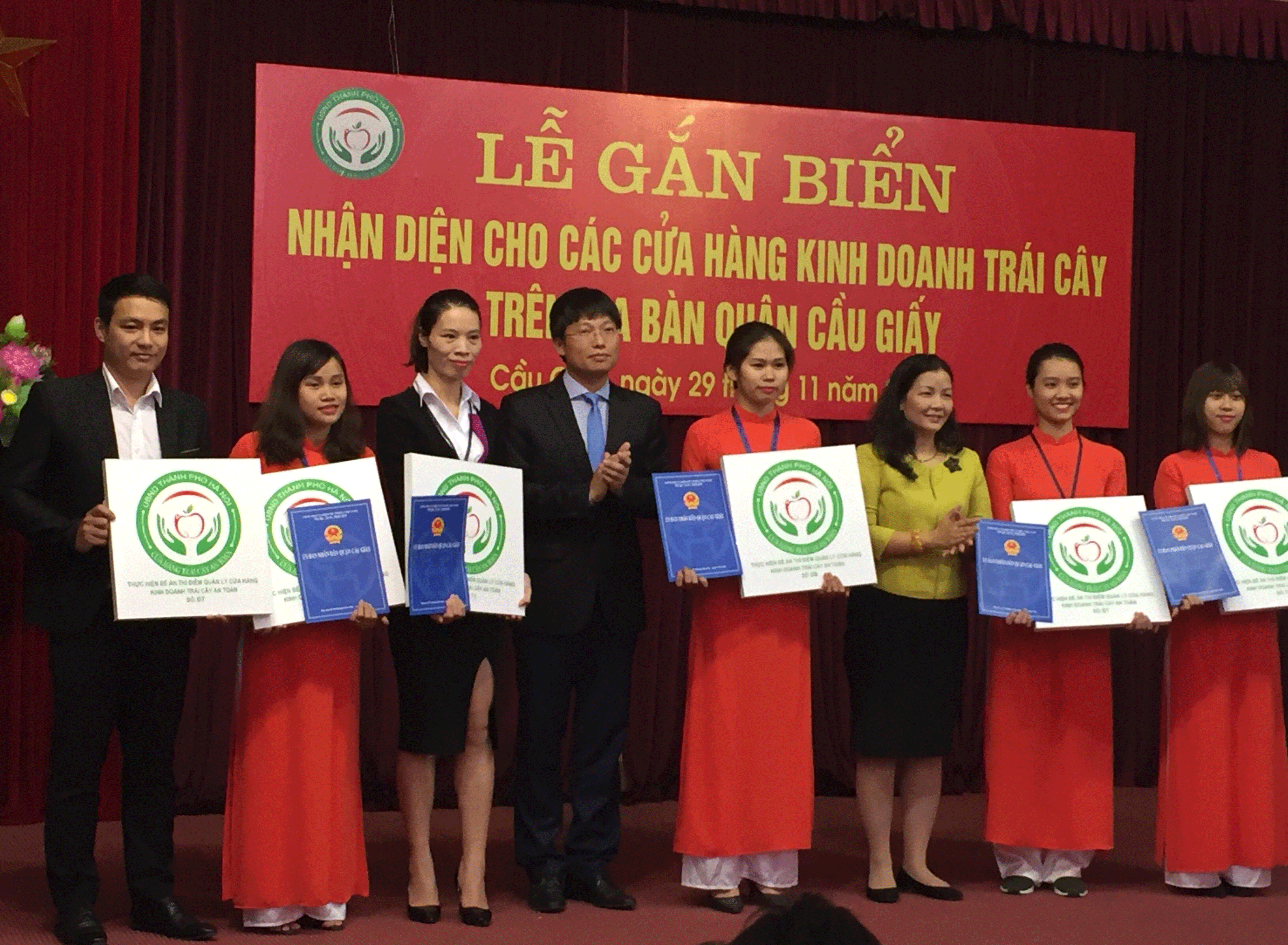 | Phó Giám đốc Sở Công Thương Hà Nội Trần Thị Phương Lan (thứ ba bên phải) cùng lãnh đạo quận Cầu Giấy trao biển “Nhận diện cửa hàng kinh doanh trái cây” cho đại diện 6 cửa hàng |