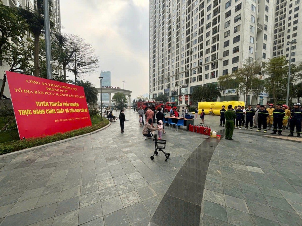Sáng 24/3, Phòng Cảnh sát phòng cháy chữa cháy và cứu nạn cứu hộ (PC07 - Công an TP. Hà Nội) cho biết, trong 2 ngày 22 và 23/3, Tổ địa bàn Phòng cháy chữa cháy và cứu nạn cứu hộ Bắc Từ Liêm phối hợp cùng cơ sở tòa nhà chung cư 1A, 2A Vinaconex (phường Phú Diễn) và tòa nhà chung cư An Bình City (phường Cổ Nhuế 1) tổ chức các hoạt động tuyên truyền, trải nghiệm, thực hành phòng cháy chữa cháy và cứu nạn cứu hộ quý I/2025. Sự kiện có sự tham gia của 1.000 người dân.