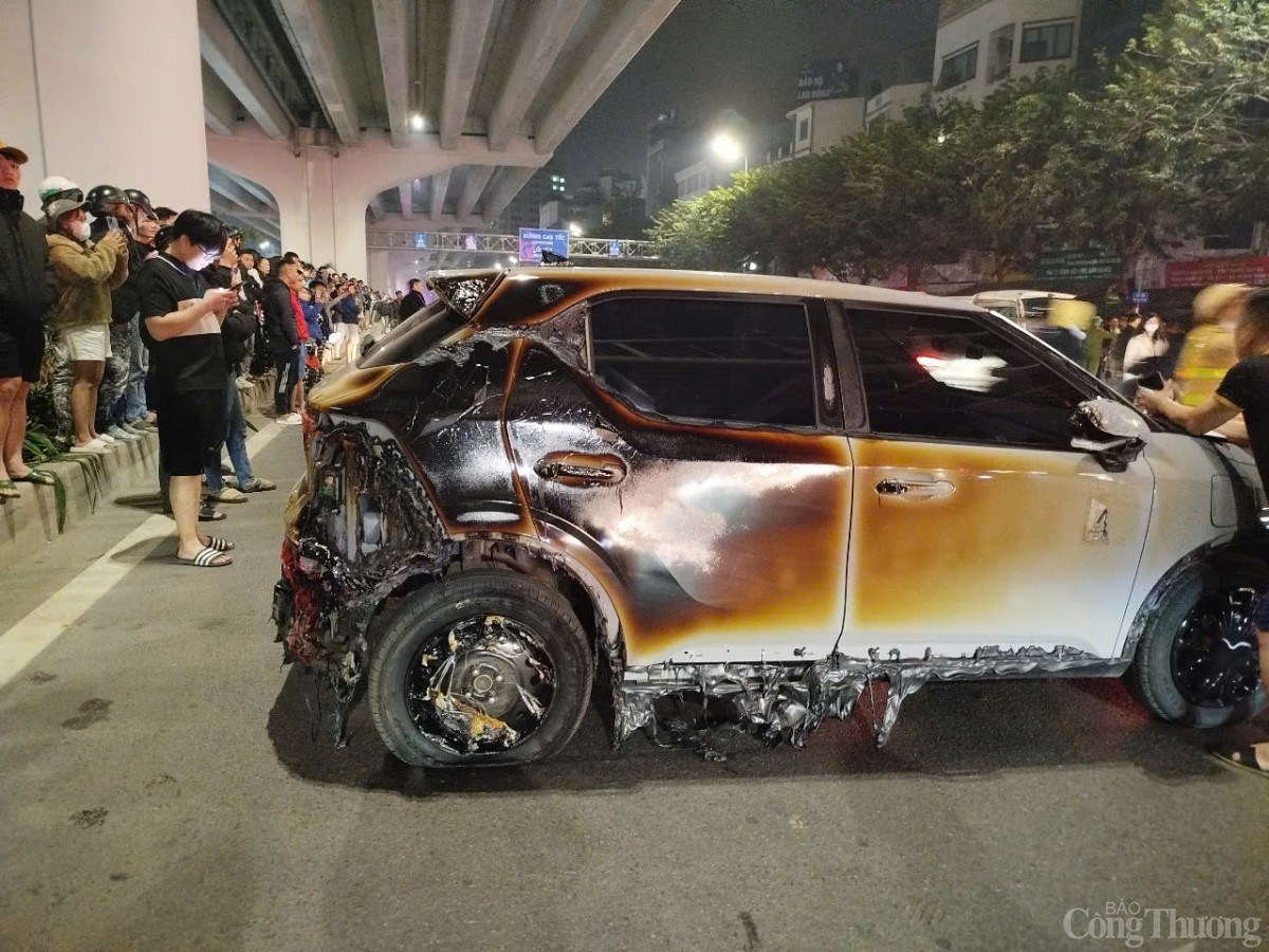 | Chiếc xe ô tô cũng bị cháy sém được di chuyển ra giữa ngoài đường Phạm Văn Đồng |