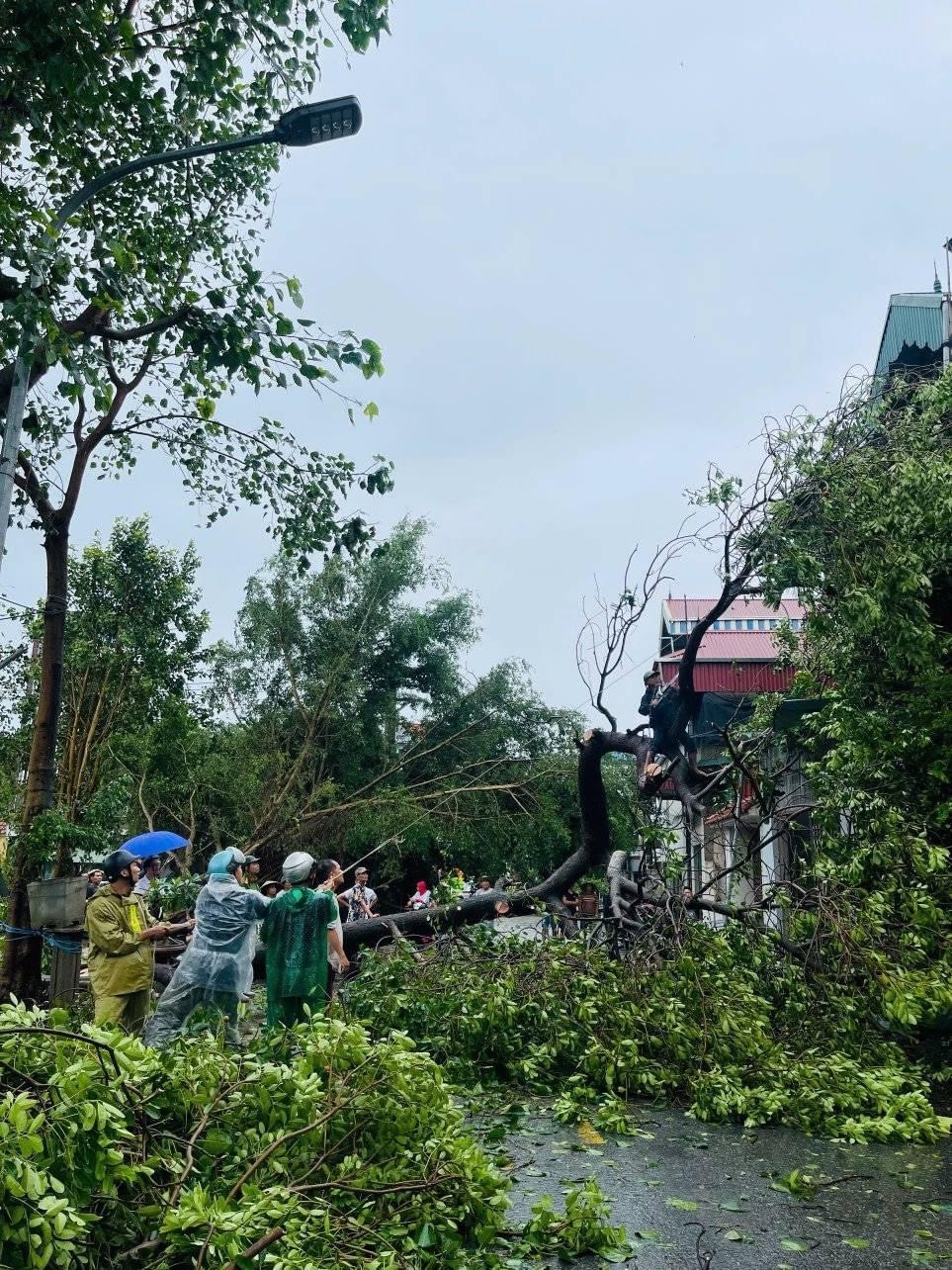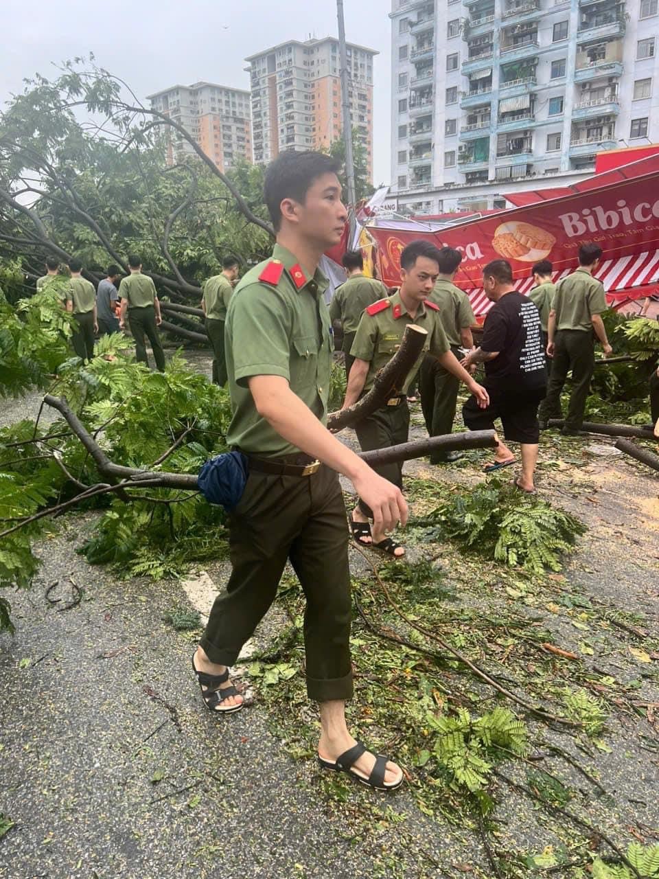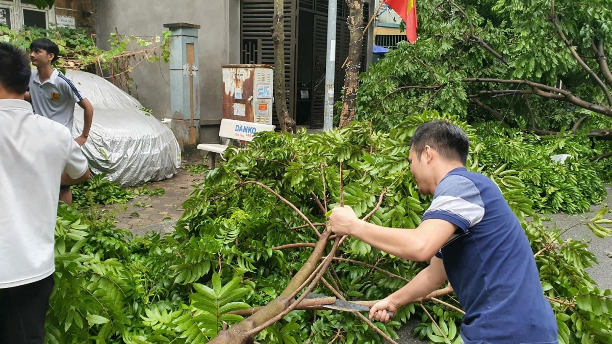 Dưới cơn mưa rả rích, lực lượng Công an Hà Nội và người dân tất bật dọn dẹp hậu quả của cơn bão. Anh Nguyễn Anh Tuấn (tại Khương Đình, Thanh Xuân, Hà Nội) chia sẻ, đêm qua, gió bão rít từng cơn, đập mạnh vào cửa sổ khiến anh không dám ra khỏi nhà. Sau khi cơn bão đi qua, anh cùng gia đình và hàng xóm nhanh chóng bắt tay dọn dẹp, khắc phục hậu quả.