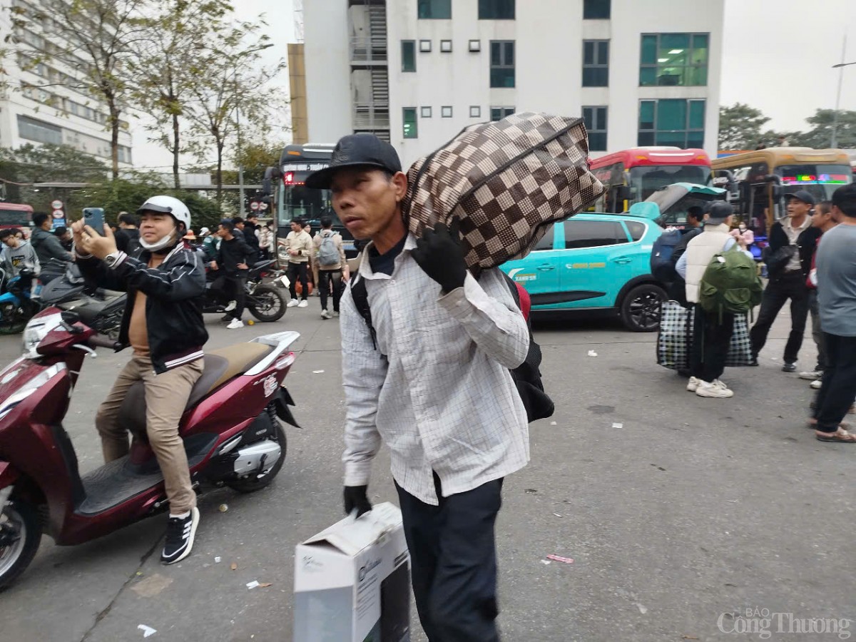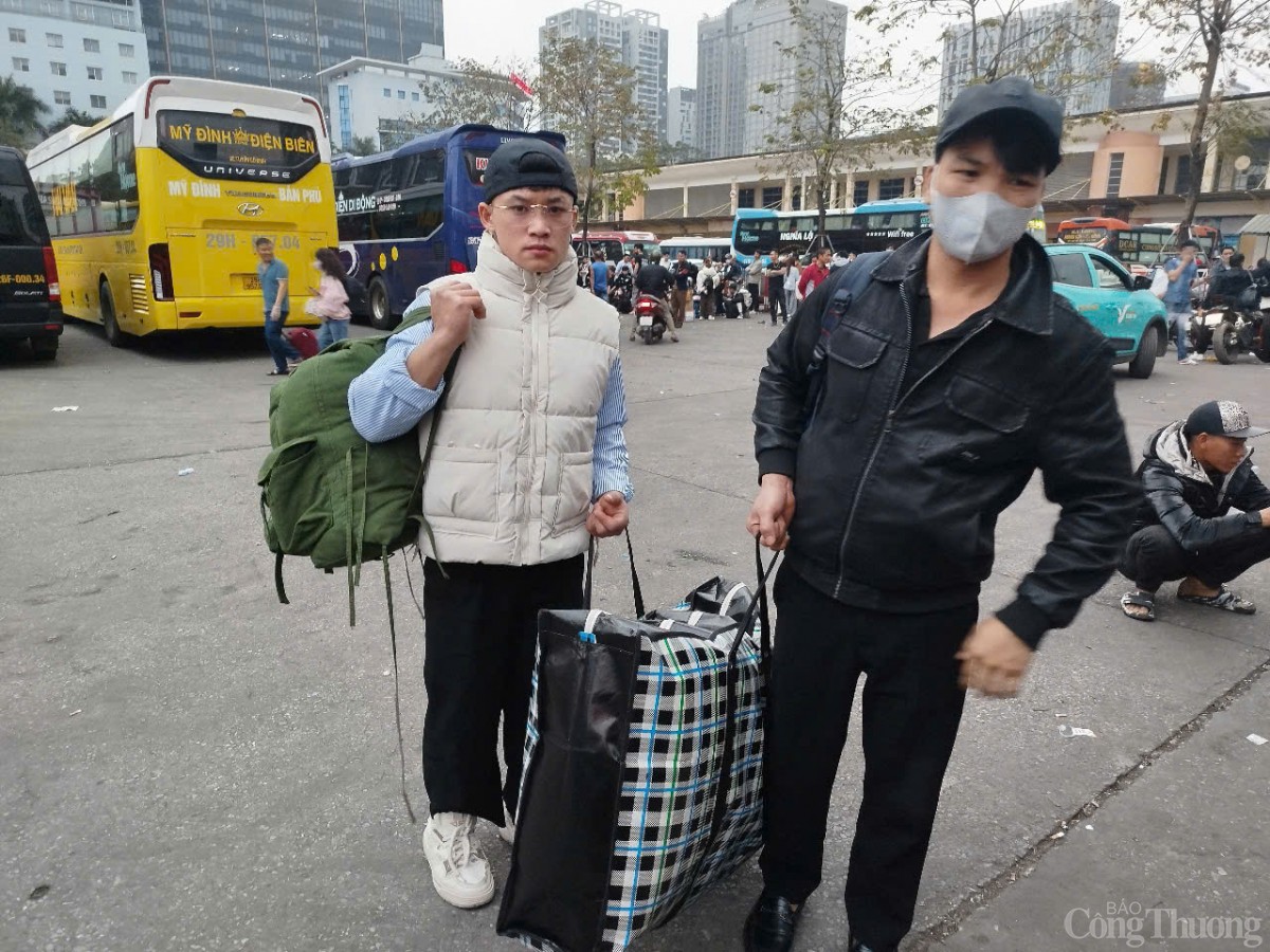 Đang khệ nệ mang vác đồ đạc trên vai, ông Vàng A Cơ, quê ở Điện Biên chia sẻ, ông xuống Hà Nội làm phụ hồ hơn 3 tháng nay. Hôm nay, ông được chủ cai thầu cho về quê ăn Tết cùng với gia đình đến qua Rằm tháng Giêng xuống làm tiếp.