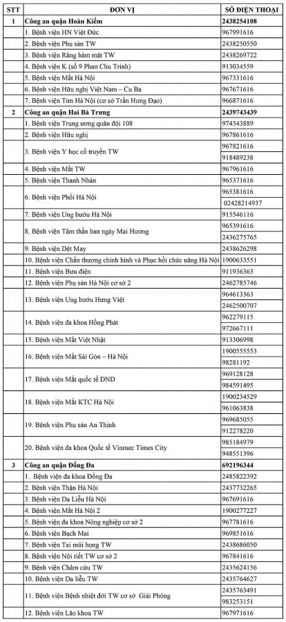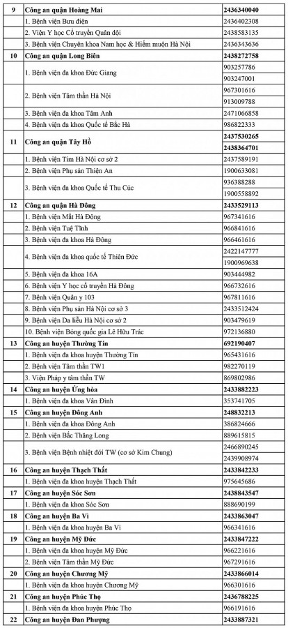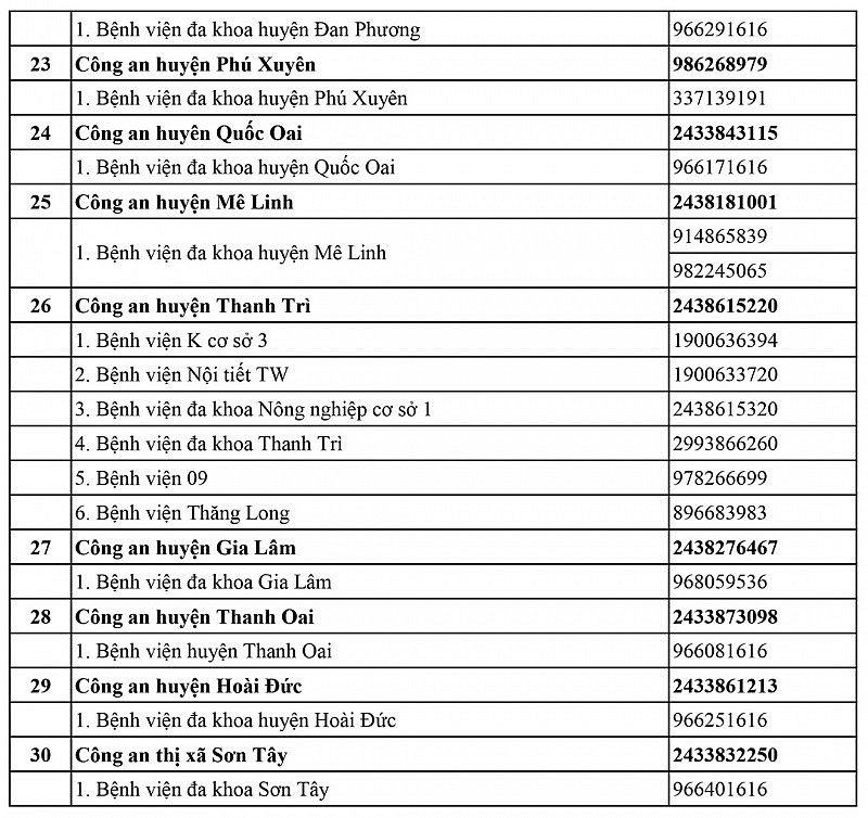 Dưới đây là danh sách đường dây nóng của công an 30 quận, huyện, thị xã và các bệnh viện trên địa bàn để phối hợp trong công tác bảo đảm an ninh trật tự: