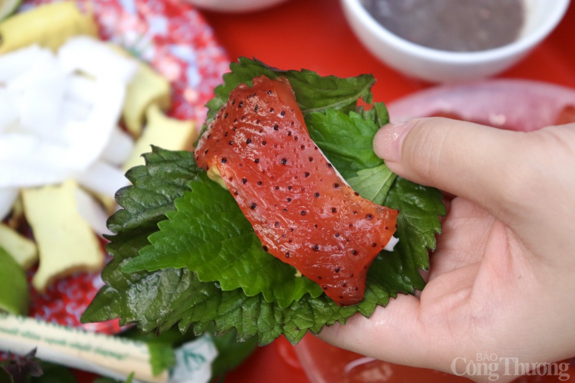 Những miếng sứa đỏ au được thái thành từng lát vừa ăn, bày vào đĩa