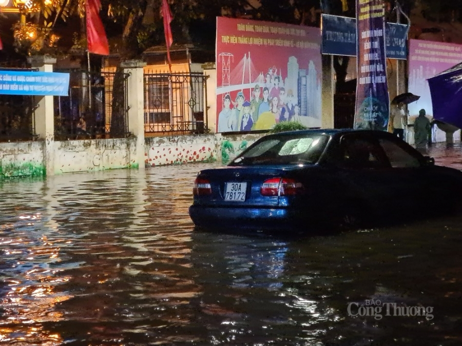 | Một chiếc ô tô ngập sâu trên đường Nguyễn Phong Sắc |