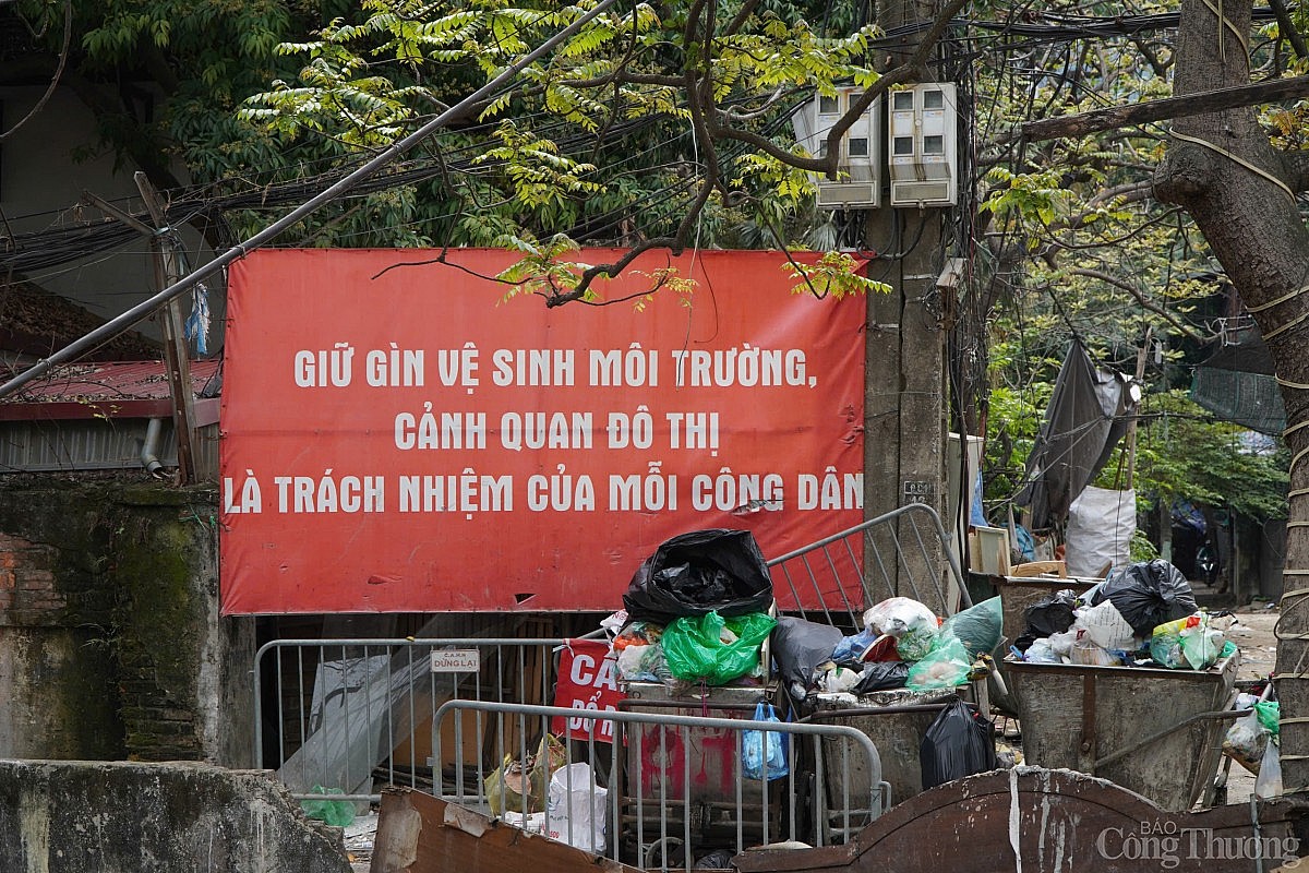 | Rác được tập kết ngay dưới biển tuyên truyền giữ gìn vệ sinh của cơ quan chức năng. |