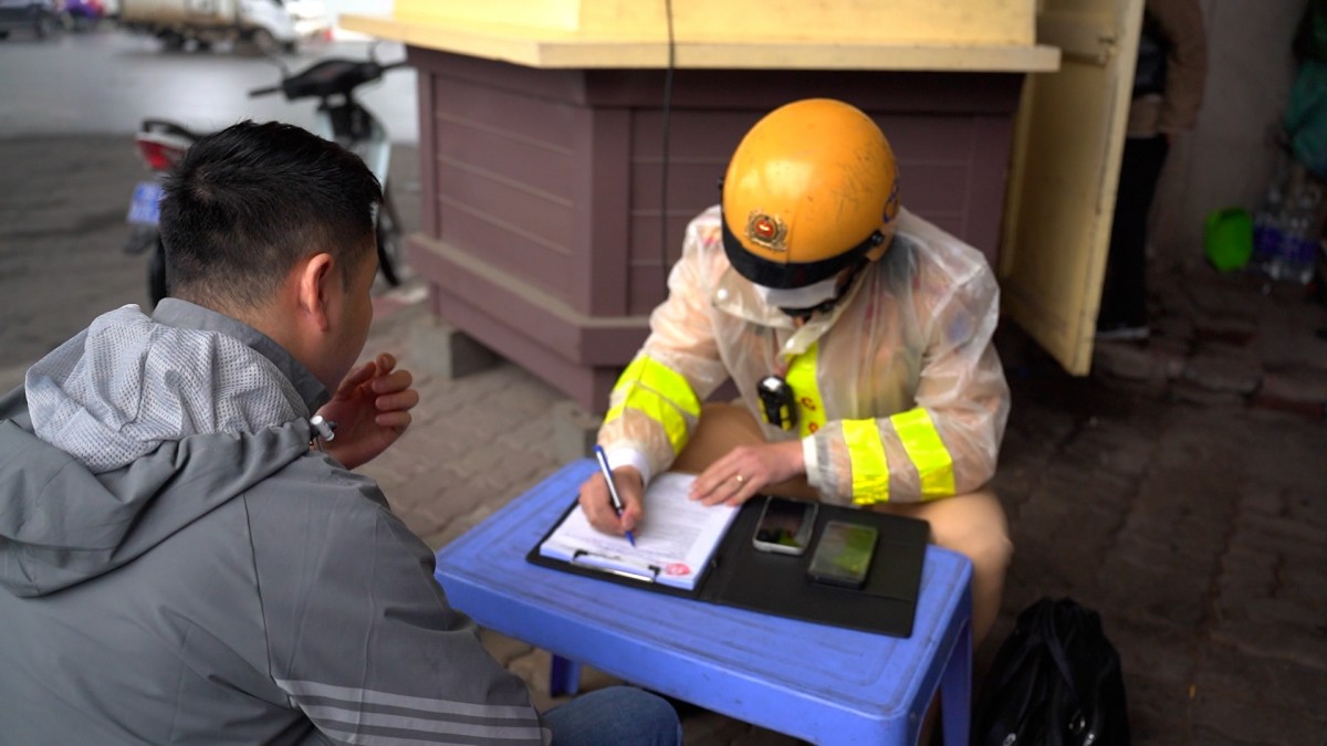 | Vừa lập biên bản, Trung tá Hiệp vừa tuyên truyền tới tài xế vi phạm về luật an toàn giao thông |