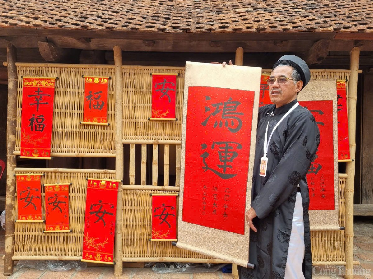 | Ông đồ Nguyễn Văn Sáu vừa hoàn thành xong chữ thư pháp "hồng vận" cho khách tham quan tại Bảo tàng Dân tộc học Việt Nam. |