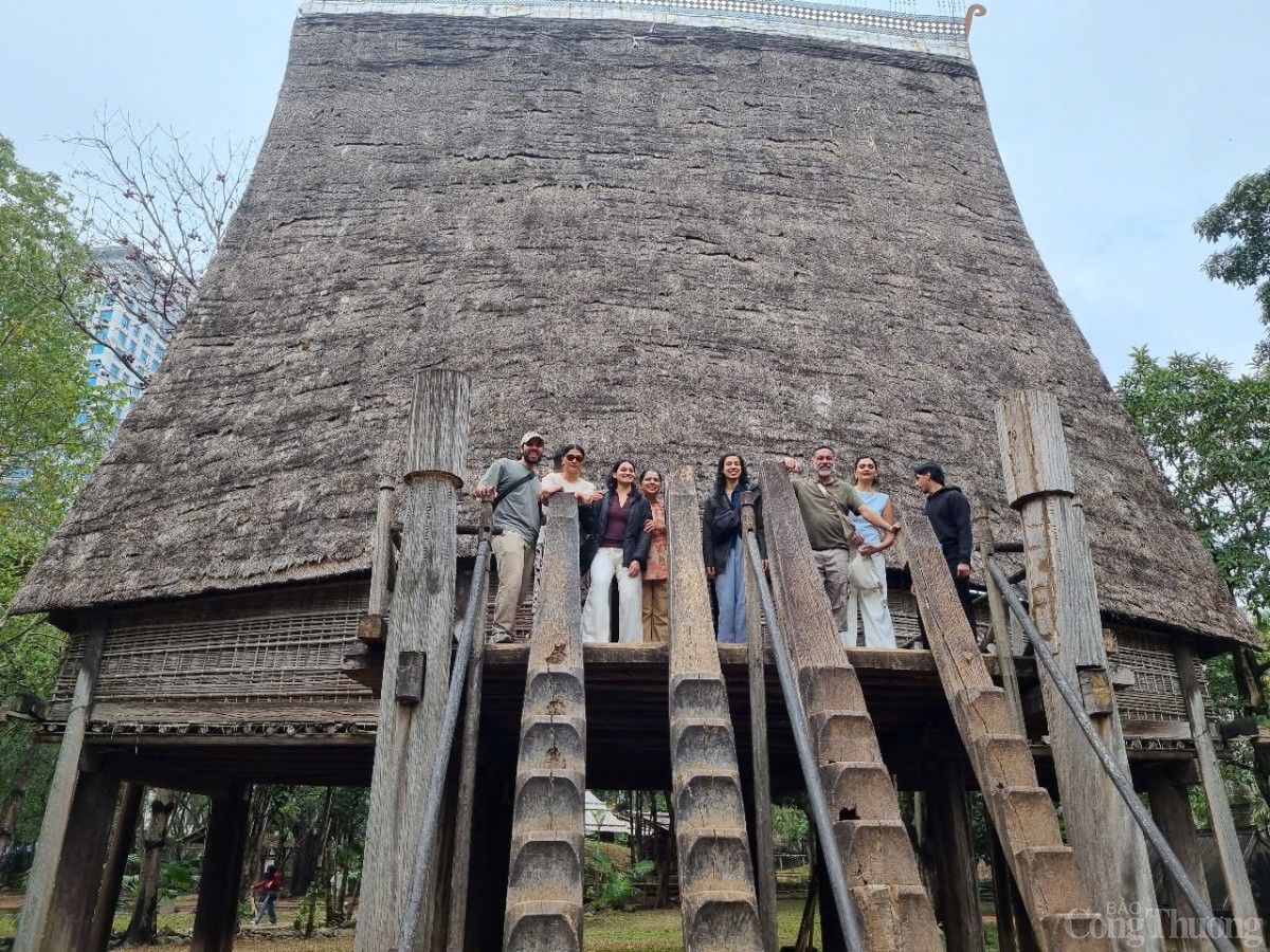 | Du khách nước ngoài thích thú chụp ảnh bên nhà rông tại Bảo tàng Dân tộc học Việt Nam. |