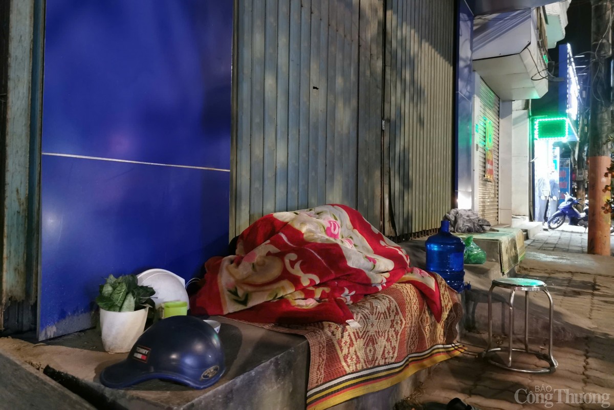 Một tiểu thương chỉ có chiếc chăn mỏng cùng tấm chiếu vạ vật trước hiên nhà người dân ven đường để ngủ lại qua đêm.