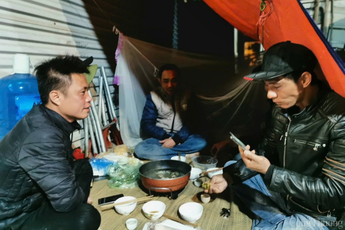 Hơn 21h, nhóm bán cây của anh Trần Duy Hiệp tại ven quốc lộ 32 thuộc thị trấn Trạm Trôi, huyện Hoài Đức, TP. Hà Nội mới có thời gian rảnh để dùng bữa tối trong căn lều dựng tạm ven đường với vài gói mì tôm cùng ít đồ ăn đã lạnh ngắt.