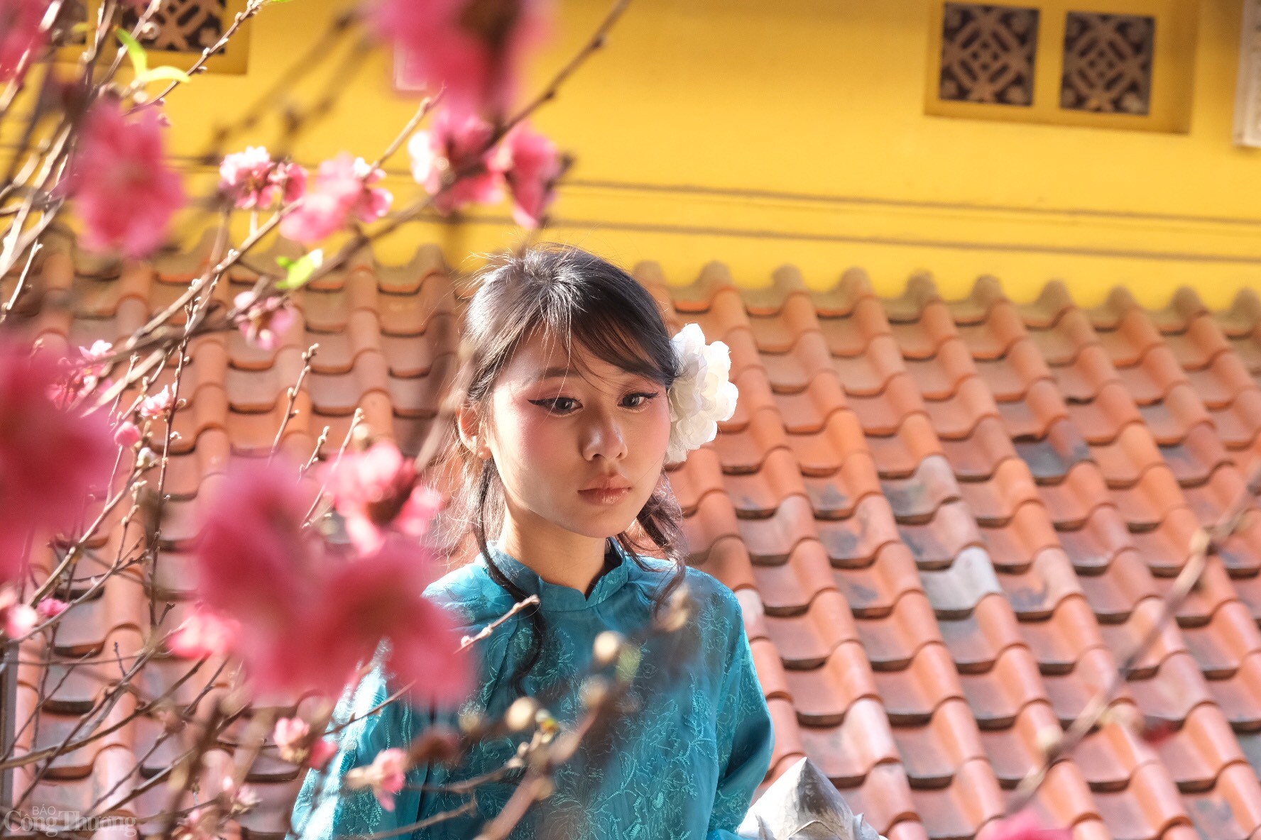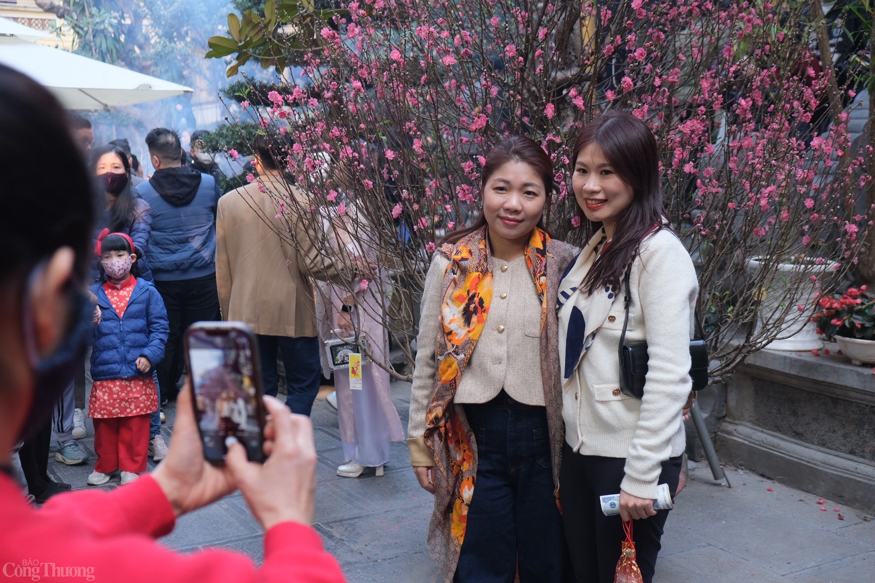 | Khách tham quan lưu giữ khoảnh khắc cầu an đầu năm tại chùa Quán Sứ. Ảnh: Lê An |