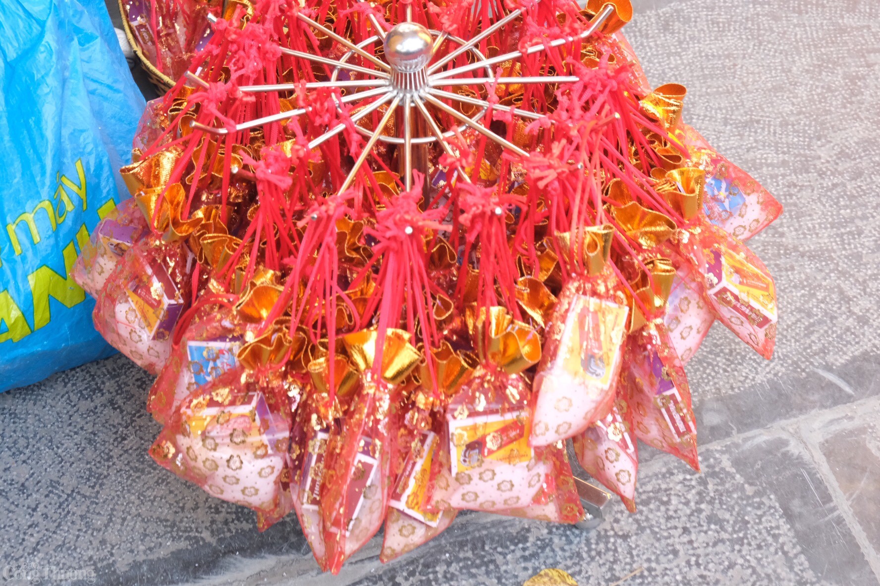 | Văn hóa "Đầu năm mua muối, cuối năm mua vôi" giúp các gói muối, bao diêm đắt khách, được bán với giá 15.000 đồng/gói tại chùa. Ảnh: Lê An |