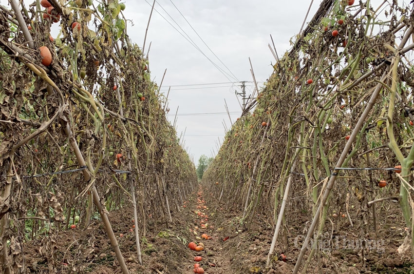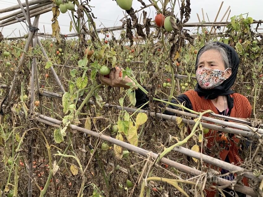 Không chỉ củ cải, cải bẹ xanh, bà Hoàng Thị Đặt (xã Tráng Việt, Mê Linh) cũng có mấy ruộng cà chua vào đúng vụ thu hoạch, cà chua chín rơi vãi đầy ruộng mà không bán được, “Dịch Covid-19 bùng phát khiến mùa thu hoạch nông sản năm nay thua nặng hơn mọi năm. Đầu vụ, thương lái đến tận ruộng thu mua với giá khoảng 18.000 đồng/kg. Giờ, giá bán rẻ như cho, đem lên chợ cũng không bán được” - bà Đặt cho hay.