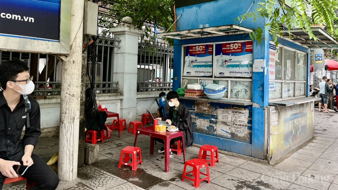 | Hàng loạt nhà chờ trước cổng trường Đại học Giao thông vận tải bị 2-3 hộ kinh doanh chiếm dụng làm nơi bán hàng nước, hàng ăn. Phía trong nhà chờ lúc nào cũng nhộn nhịp, đông đúc - Ảnh: Phương Cúc |