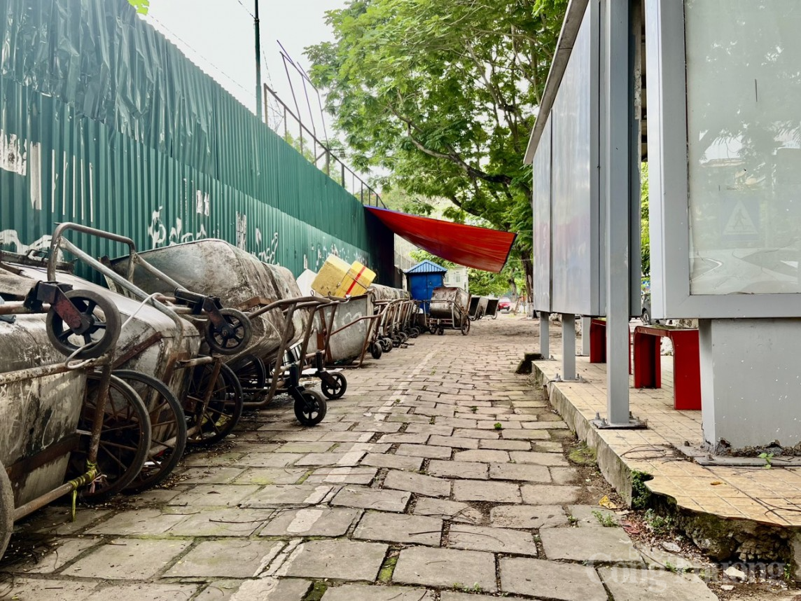 | Đằng sau nhà chờ xe buýt là nhiều xe rác nằm xếp hàng. Dù có rác hay không, vào mùa hè oi bức, hành khách vẫn phải “tạm ngửi mùi rác” trong thời gian chờ xe buýt đến - Ảnh: Phương Cúc |