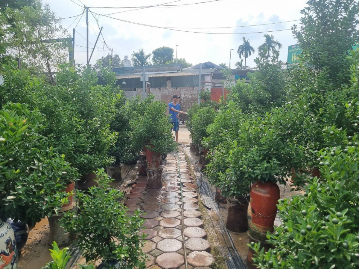 | Nhiều cây quất được người dân di chuyển lên cao để chống ngập vẫn chưa được đưa về vườn. (Ảnh: Văn Thi) |