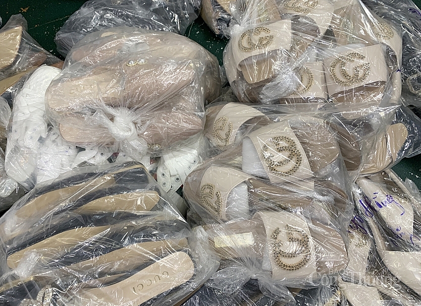 Qua kiểm đếm sơ bộ, lực lượng liên ngành đã thu giữ hàng chục bao hàng với hàng ngàn sản phẩm chủ yếu là giày, dép mang các nhãn hiệu nổi tiếng thế giới như Gucci, LV, Adidas, Burberry….
