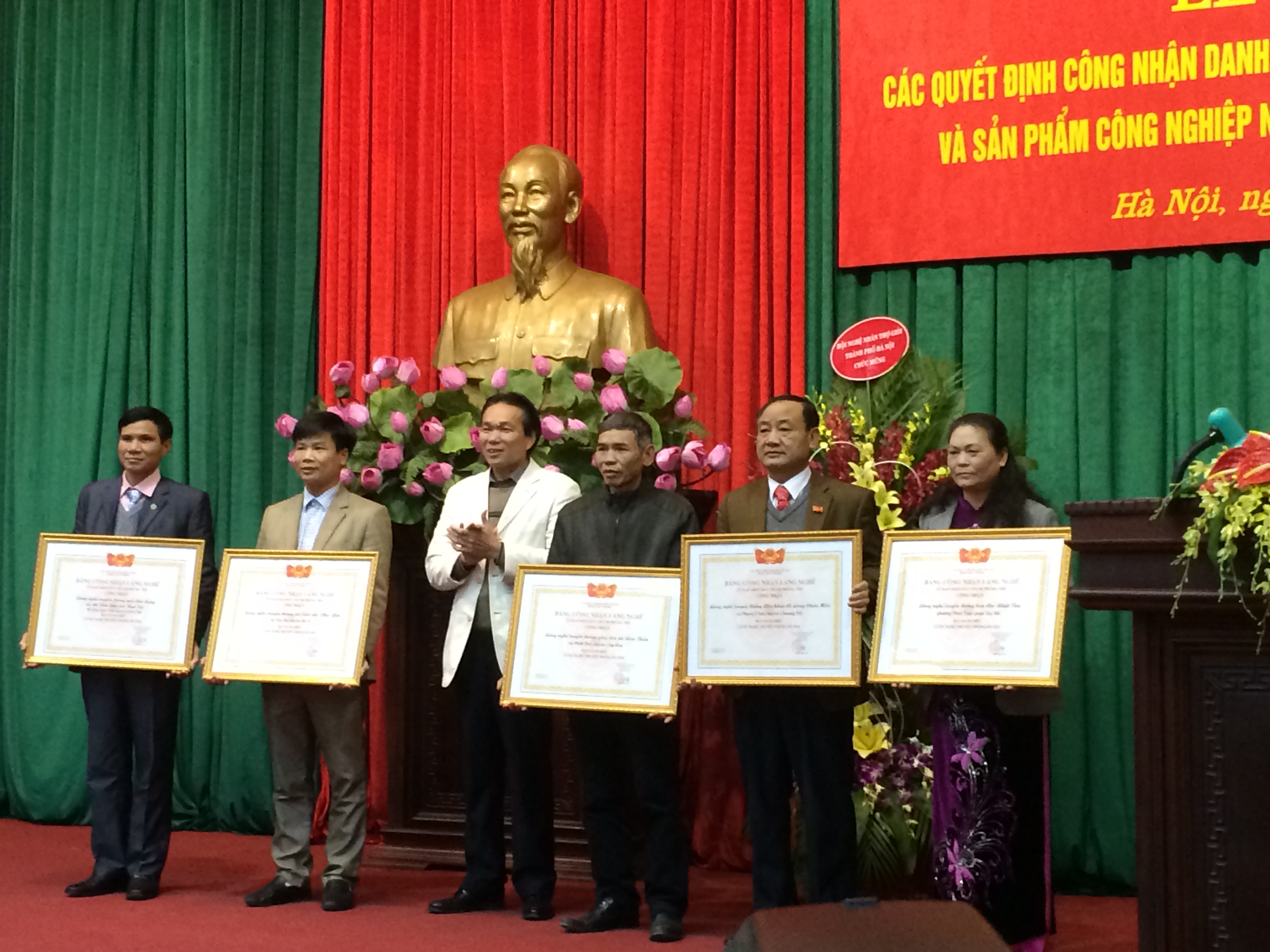UBND Thành phố Hà Nội đã quyết định công nhận danh hiệu làng nghề truyền thống Hà Nội năm 2015 cho 5 làng nghề, gồm: Làng nghề mộc dân dụng và chế biến lâm sản Ngô Sài (thị trấn Quốc Oai, huyện Quốc Oai), làng nghề chế biến chè thôn Phú Yên (xã Yên Bài, huyện Ba Vì), làng nghề điêu khắc đá thôn Long Châu Miếu (xã Phụng Châu, huyện Chương Mỹ), làng nghề hoa đào Nhật Tân, phường Nhật Tân, quận Tây Hồ) và làng nghề giày dép (thôn Thần, xã Minh Đức, huyện Ứng Hòa). Danh hiệu “Nghệ nhân Hà Nội” cũng được trao tặng cho 30 cá nhân. 36 sản phẩm của 24 đơn vị được UBND Thành phố công nhận sản phẩm công nghiệp nông thôn tiêu biểu. |