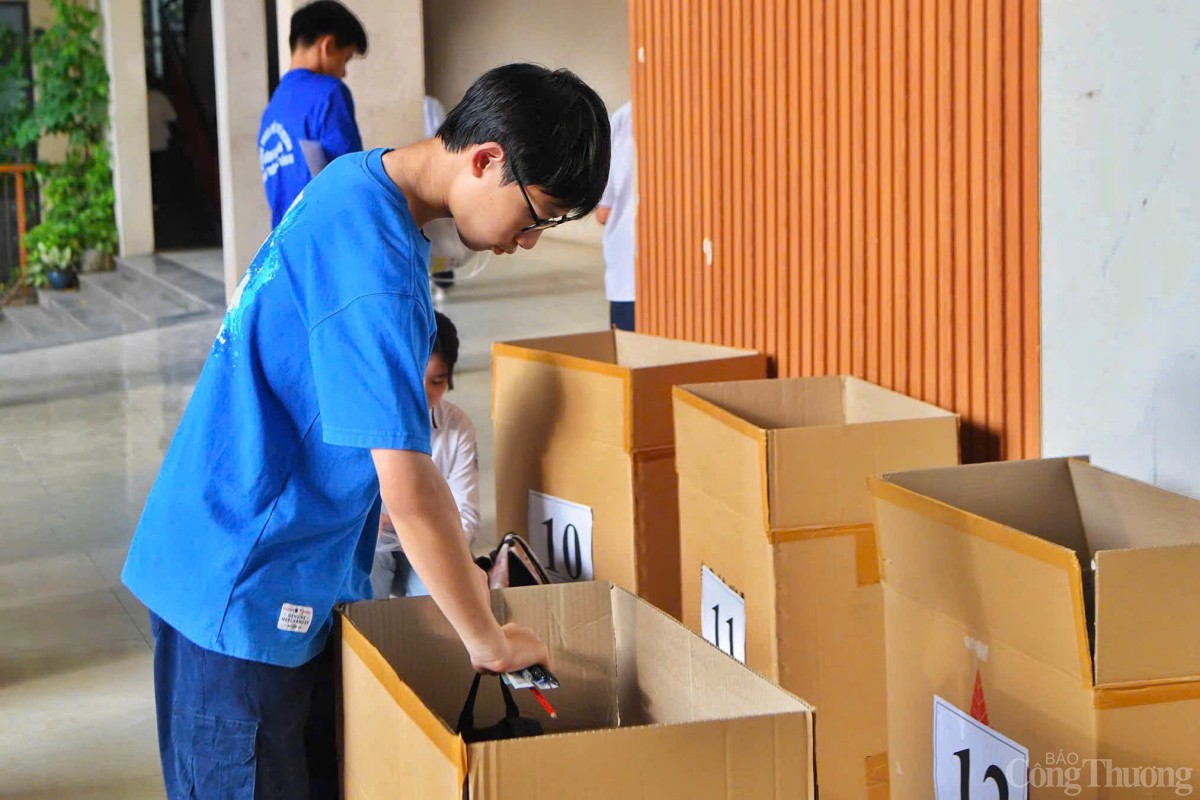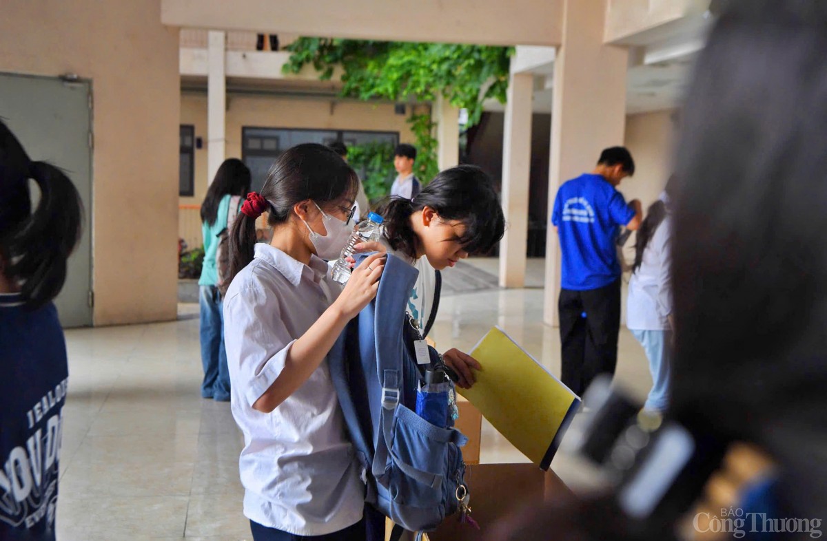 | Theo quy định, các thí sinh để toàn bộ balo, điện thoại và các thiết bị điện tử vào thùng đồ do cán bộ coi thi quản lý trước khi vào phòng thi. |
