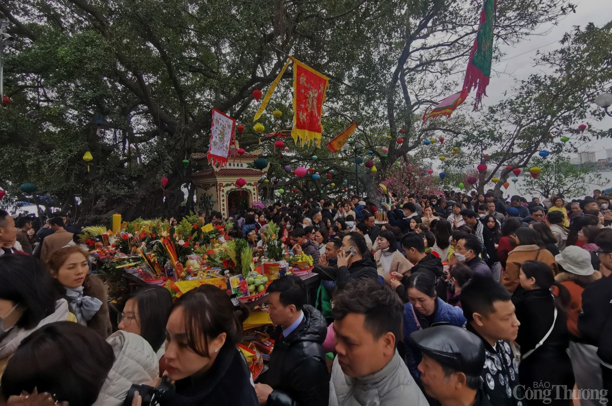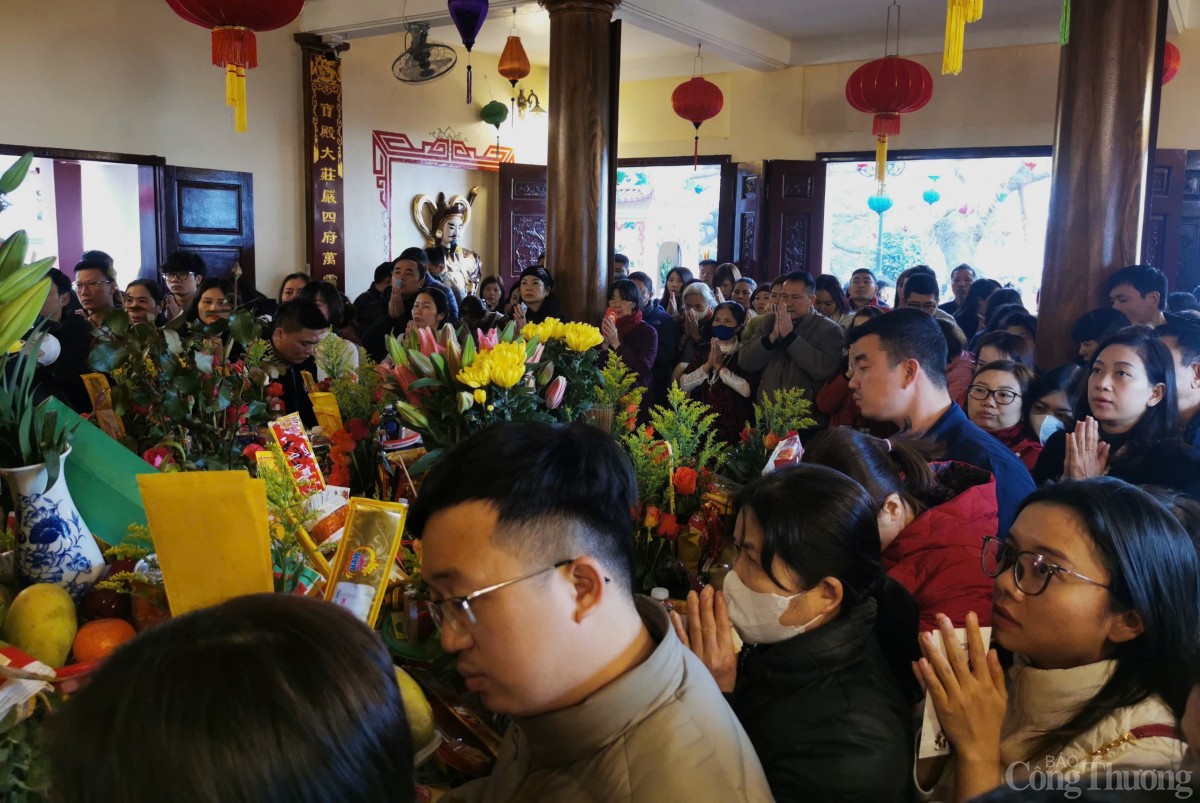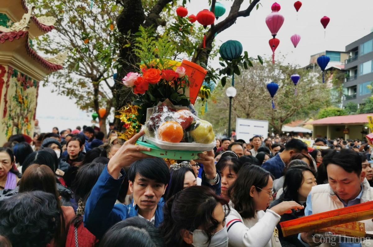 Theo ghi nhận của phóng viên Báo Công Thương, các lối vào cửa chính tới sân và điện thờ luôn chật kín người, càng về trưa, lượng người đổ về đây càng đông khiến lực lượng làm nhiệm vụ giữ gìn trật tự làm việc hết công suất để đảm bảo mỗi người du Xuân được an toàn.
