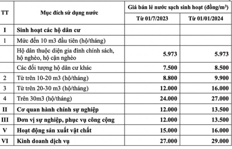 Đối với đơn vị kinh doanh dịch vụ, trong 6 tháng cuối năm 2023, mức giá được điều chỉnh từ 22.068 đồng/m3 tăng lên thành 27.000 đồng/m3; từ năm 2024 sẽ là 29.000 đồng/m3.