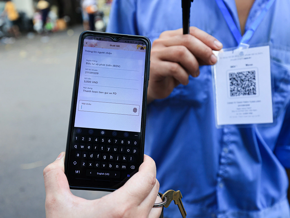 Ông Nguyễn Đức Vinh, Phó giám đốc Công ty TNHH một thành viên Khai thác điểm đỗ xe Hà Nội cho biết, việc thu phí không dùng tiền mặt đang được áp dụng thí điểm cho trông giữ xe ô tô và xe máy ở lòng đường, vỉa hè. Thông qua việc thanh toán này giúp thống kê, giám sát số lượng xe ra vào điểm, qua đó thu đúng, thu đủ và triệt tiêu được việc gian lận trong thu tiền gửi xe. Đối với xe máy, khi vào gửi xe, người dân sẽ được in ra một mã QR động, có thể thanh toán qua nhiều hình thức. Khi lấy xe, nhân viên trông xe sẽ kiểm tra đối chiếu lại qua máy quét di động.