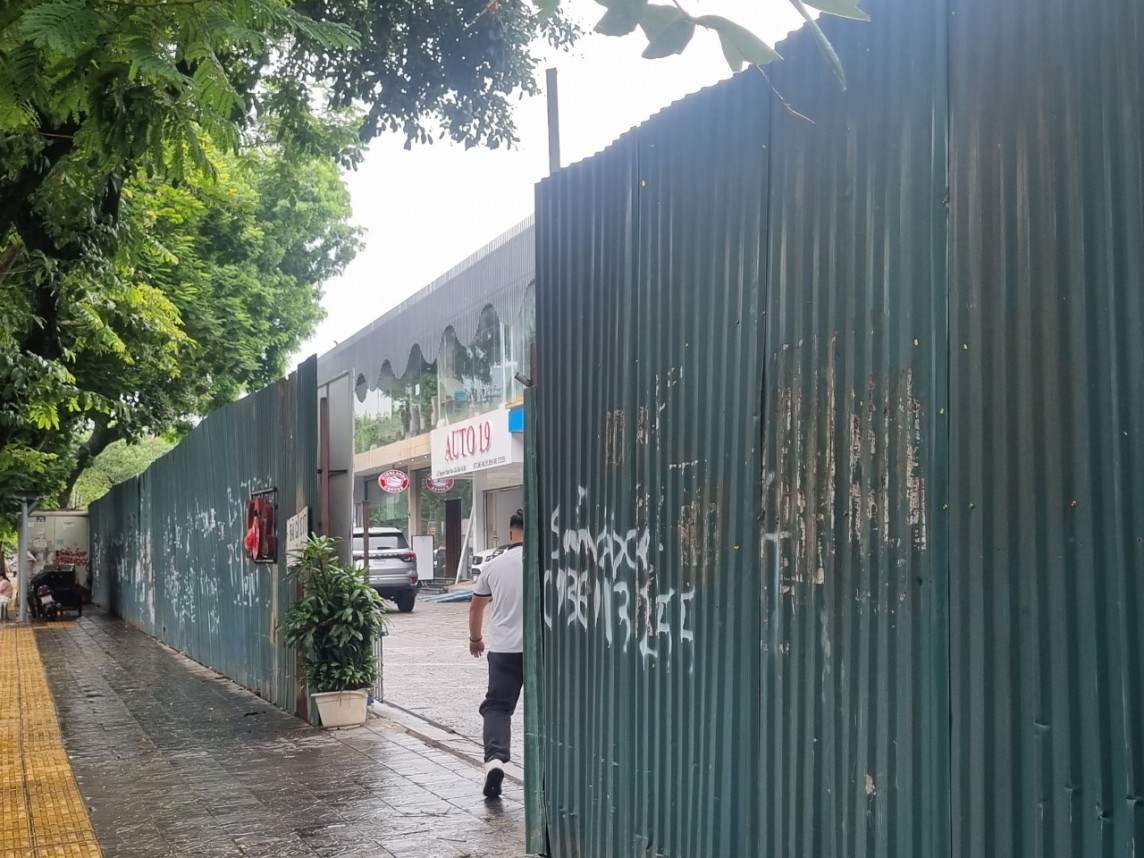 | Tại khu vực Dự án cống hóa mương thoát nước Nghĩa Đô, phía bên ngoài được quây tôn còn bên trong các cơ sở kinh doanh, văn phòng vẫn đang hoạt động . (Ảnh: Phú Quý) |