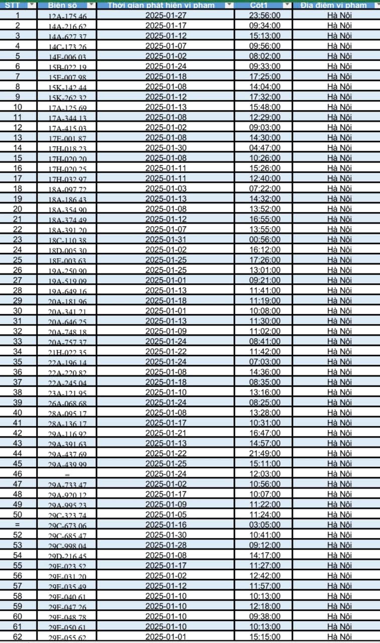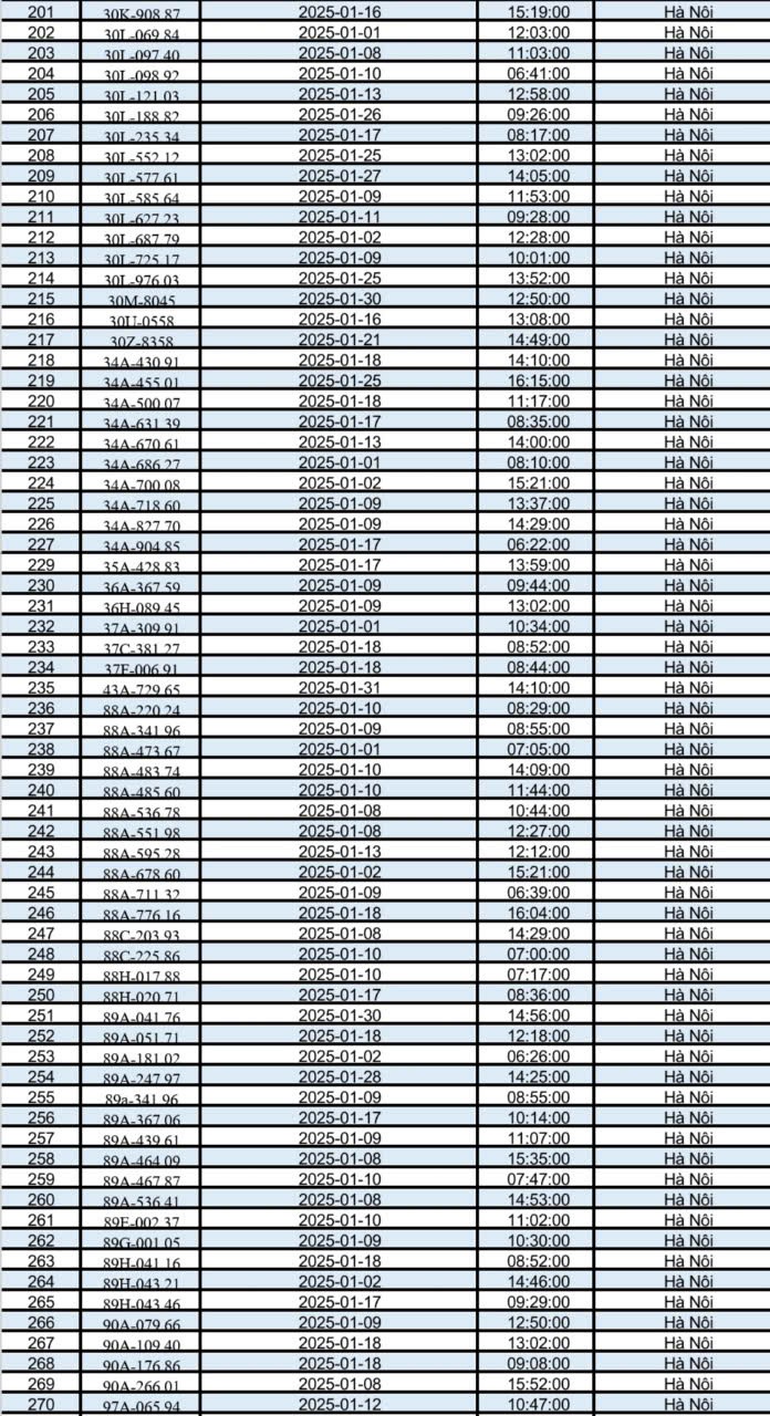 Dưới đây là danh sách 288 phương tiện ô tô vi phạm trật tự an toàn giao thông đường bộ trong tháng 1/2025: