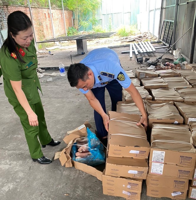 Tại thời điểm khám hàng hóa, lực lượng chức năng phát hiện 105 thùng carton bên trong chứa chân giò lợn là thực phẩm đông lạnh. Hàng hóa do nước ngoài sản xuất. Khi làm việc với Đoàn kiểm tra, chủ hàng không xuất trình được hóa đơn chứng từ chứng minh nguồn gốc xuất xứ hợp pháp của lô hàng.