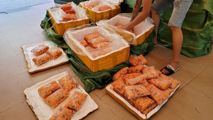 Qua kiểm tra, Đoàn kiểm tra Đội Quản lý thị trường số 5 phát hiện trên xe đang có 600kg tràng trứng gà non không rõ nguồn gốc xuất xứ, đã biến đổi màu săc, bốc mùi khó chịu.