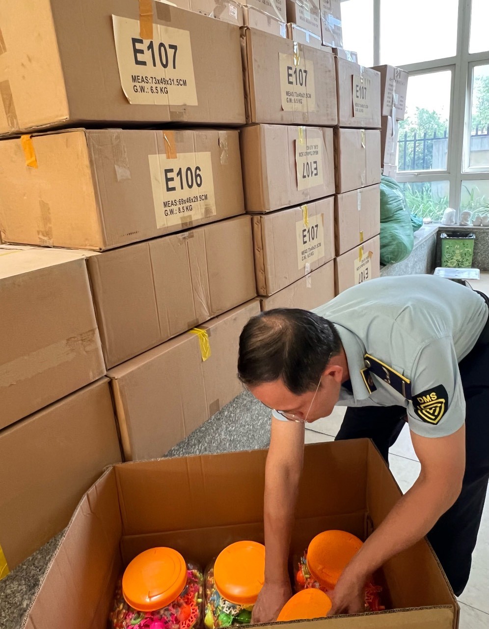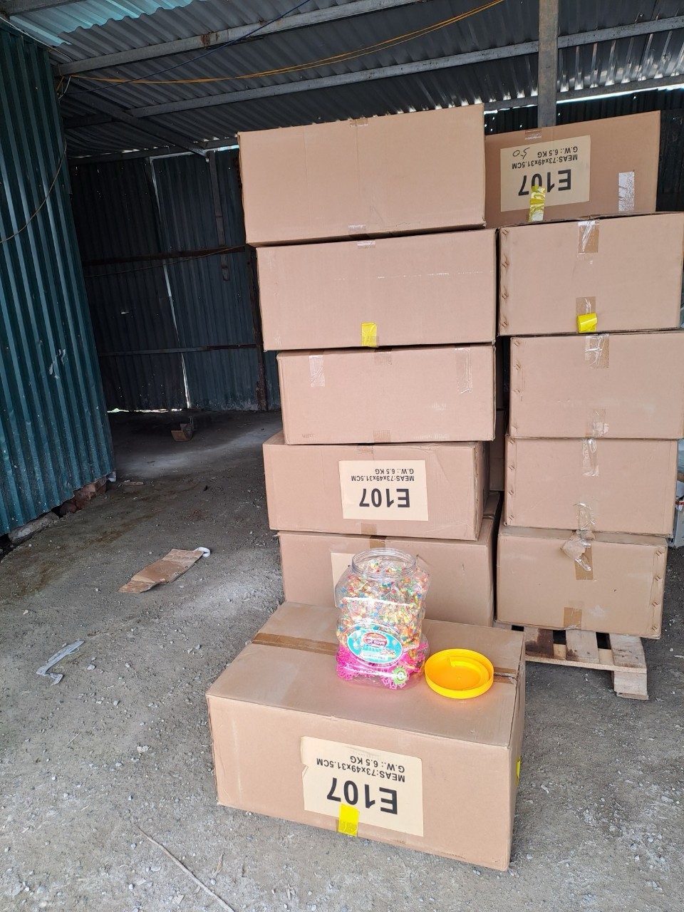 Tại thời điểm khám, Đội Quản lý thị trường số 7 và cơ quan phối hợp phát hiện tại điểm tập kết hàng hóa tại nhà mái tôn nằm trong Khu tổ hợp ga Ngọc Hồi, xã Ngọc Hồi, huyện Thanh Trì, Hà Nội có 10.800 gói kẹo đựng trong 15 thùng carton có ghi nhãn chữ nước ngoài.