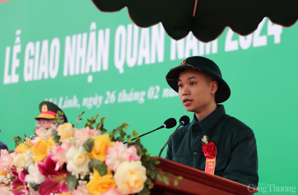 | Tân binh Nguyễn Quốc Triệu thay mặt cho các tân binh của huyện Mê Linh cảm ơn các cấp chính quyền, gia đình đã hết sức quan tâm chăm sóc, giáo dục và ủng hộ để các tân binh an tâm lên đường làm nhiệm vụ; đồng thời xin hứa sẽ chuyên tâm rèn luyện, phấn đấu trở thành chiến sĩ quân đội, công an nhân dân ưu tú |