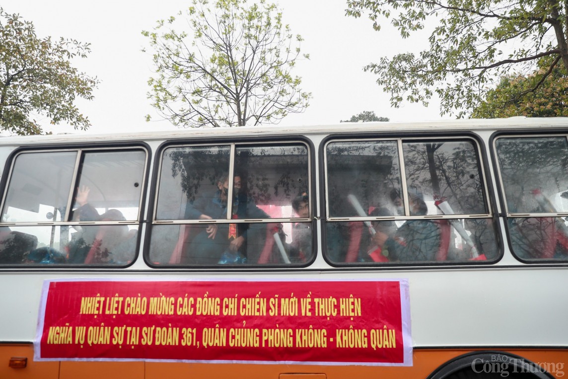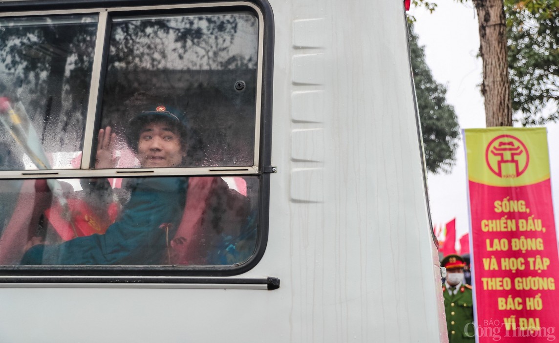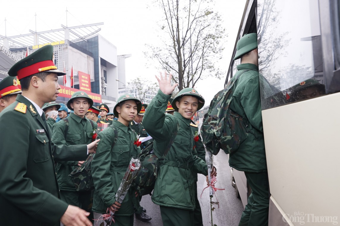 | Các tân binh vẫy chào người thân để lên đường nhập ngũ |