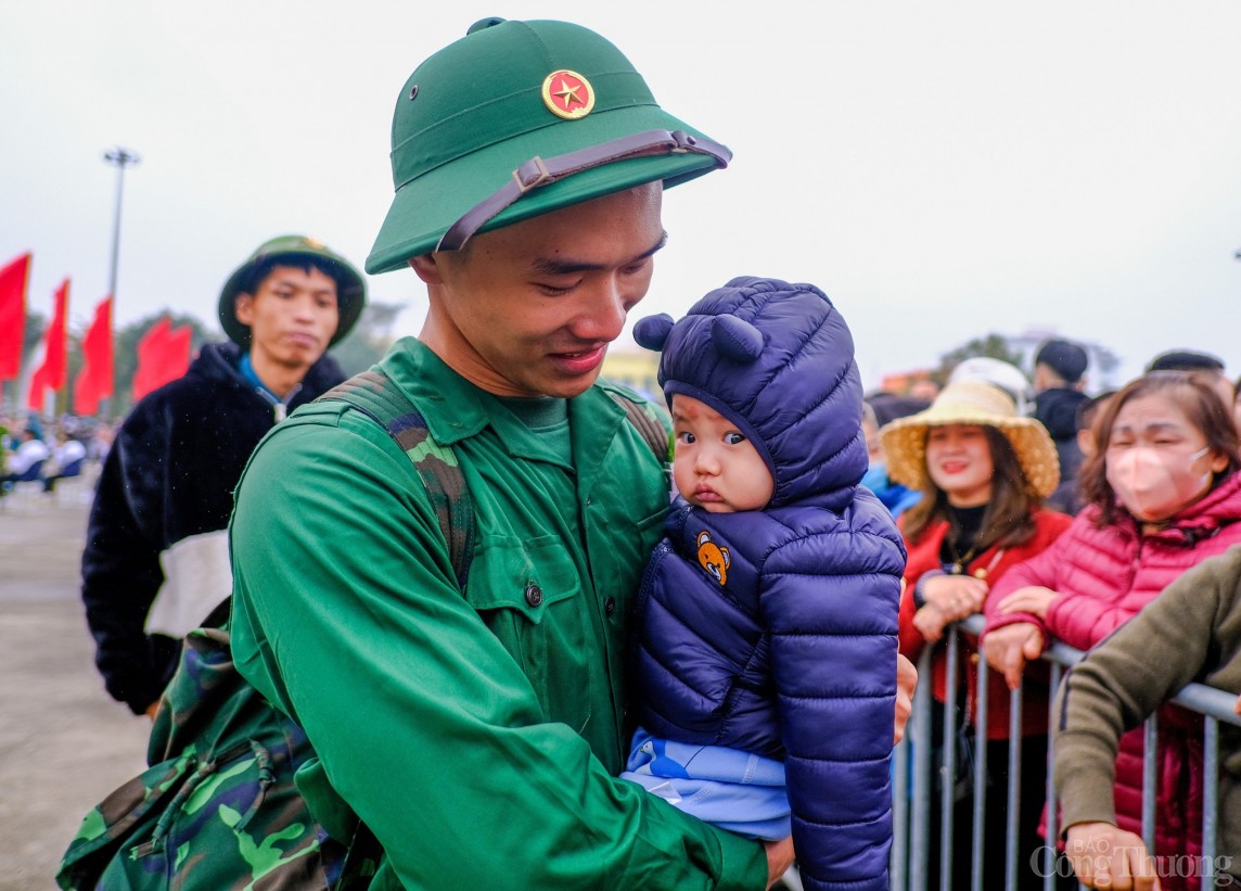 | Tân binh Nguyễn Văn Duy (24 tuổi) bế trên tay con trai mình trước khi lên đường làm nhiệm vụ thiêng liêng của Tổ quốc. "Em khá buồn khi phải rời xa gia đình cũng như vợ và đặc biệt là con trai em. Nhưng vì nhiệm vụ quốc gia và cũng là tự hào của thanh niên quê hương Hai Bà Trưng em đã sẵn sàng để rèn luyện trở thành một anh Bộ đội Cụ Hồ. Đây cũng sẽ là một trong những kỷ niệm để em có thể kể cho con trai em khi bạn ấy lớn", tân binh Nguyễn Văn Duy nói |