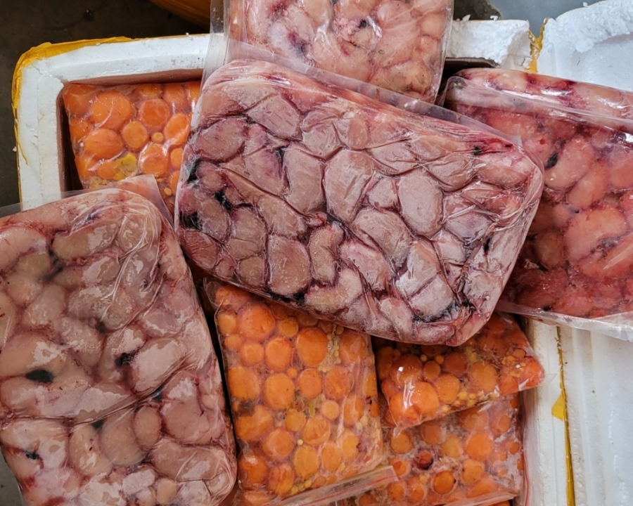 | Hàng hóa gồm 10 tấn nội tạng động vật bao gồm tràng trứng, nầm lợn, kê gà, cánh gà, lườn ngỗng hun khói, râu bạch tuộc đựng trong các thùng xốp và bao tải dứa màu xanh. Phần lớn các loại hàng hóa đều có nhãn mác, bao bì nước ngoài. |